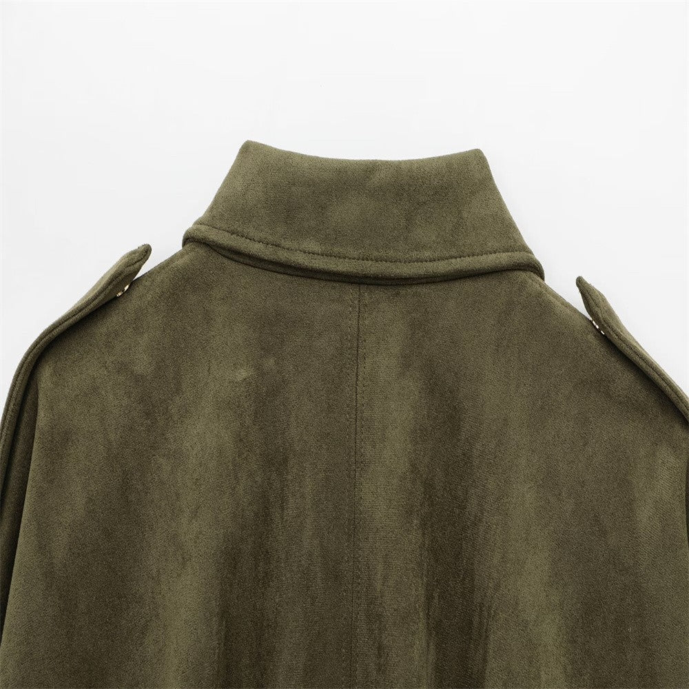 2025 Women Faux Suede Collared Jacket with Shoulder Straps Loose Fit Stylish Olive Green for Sale on