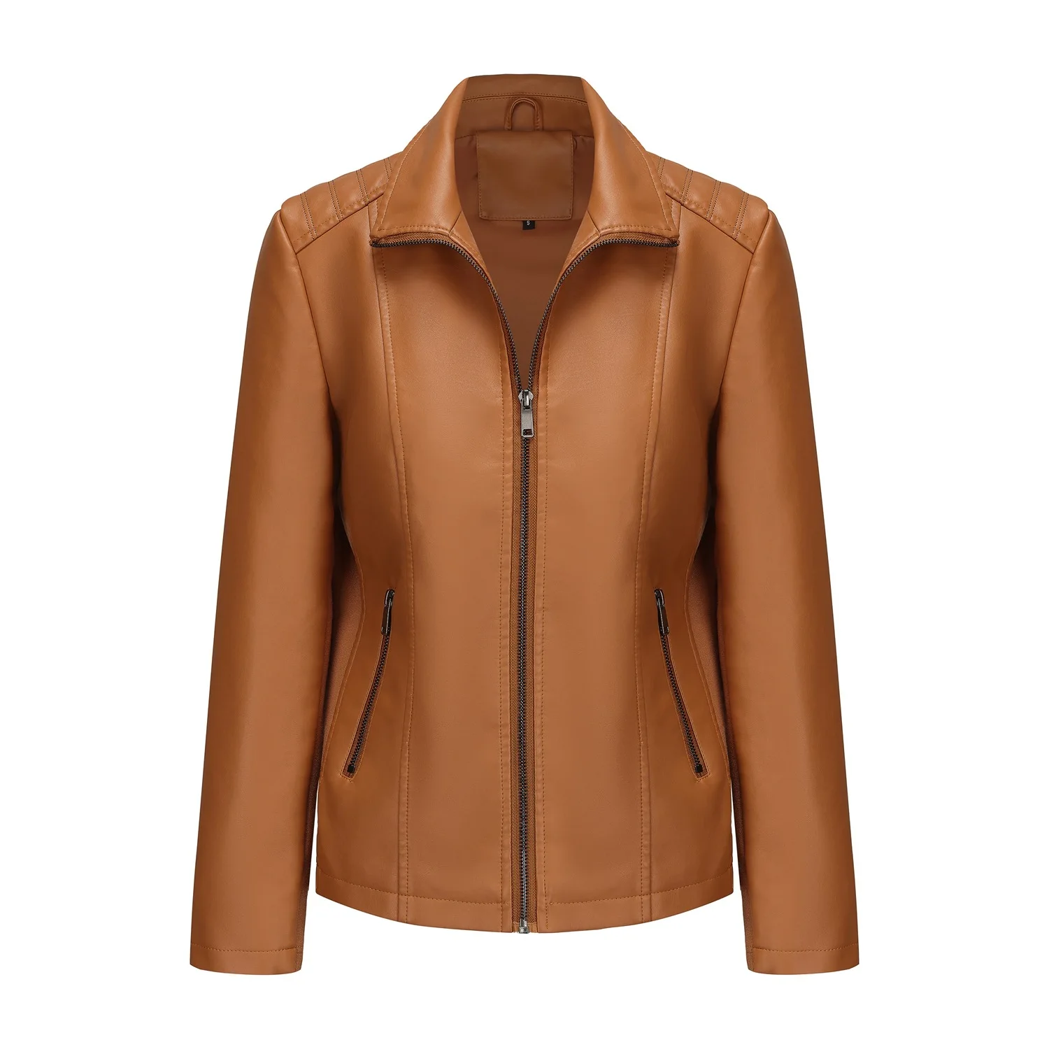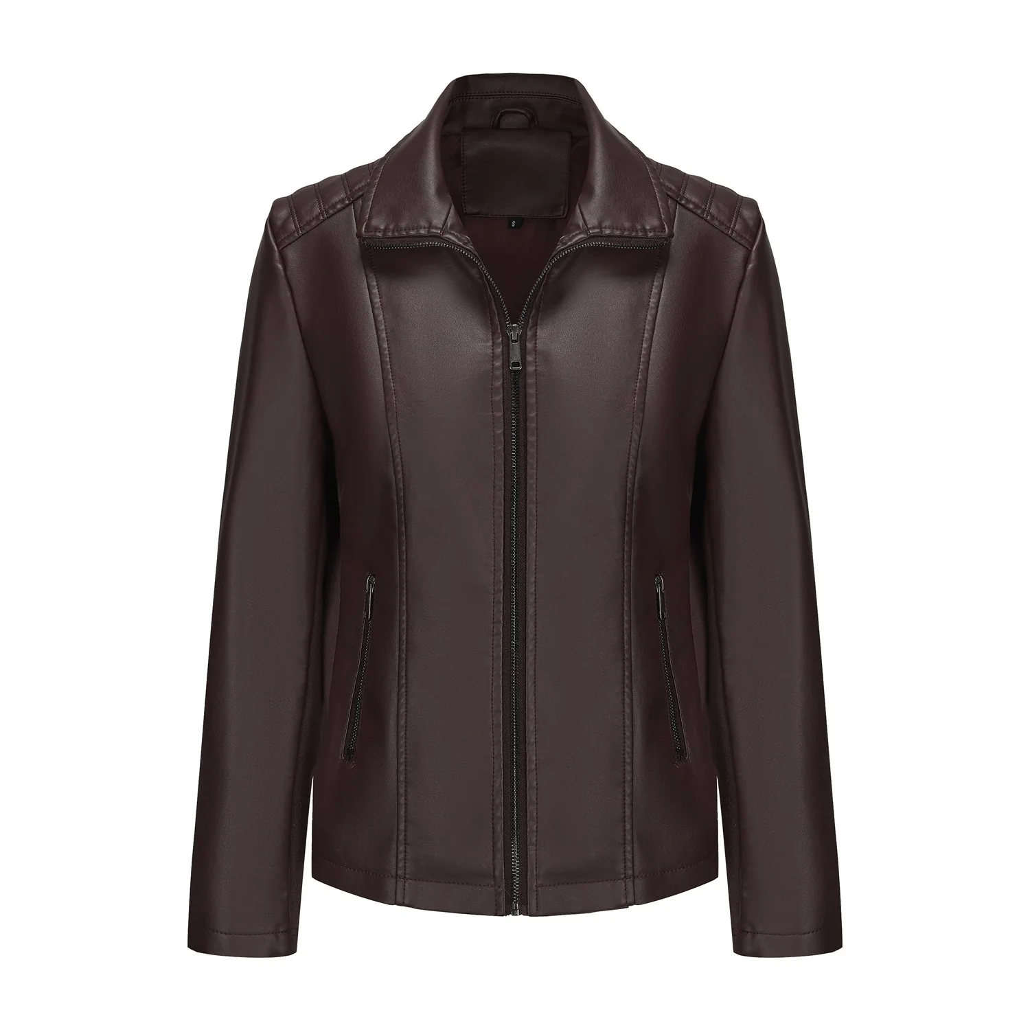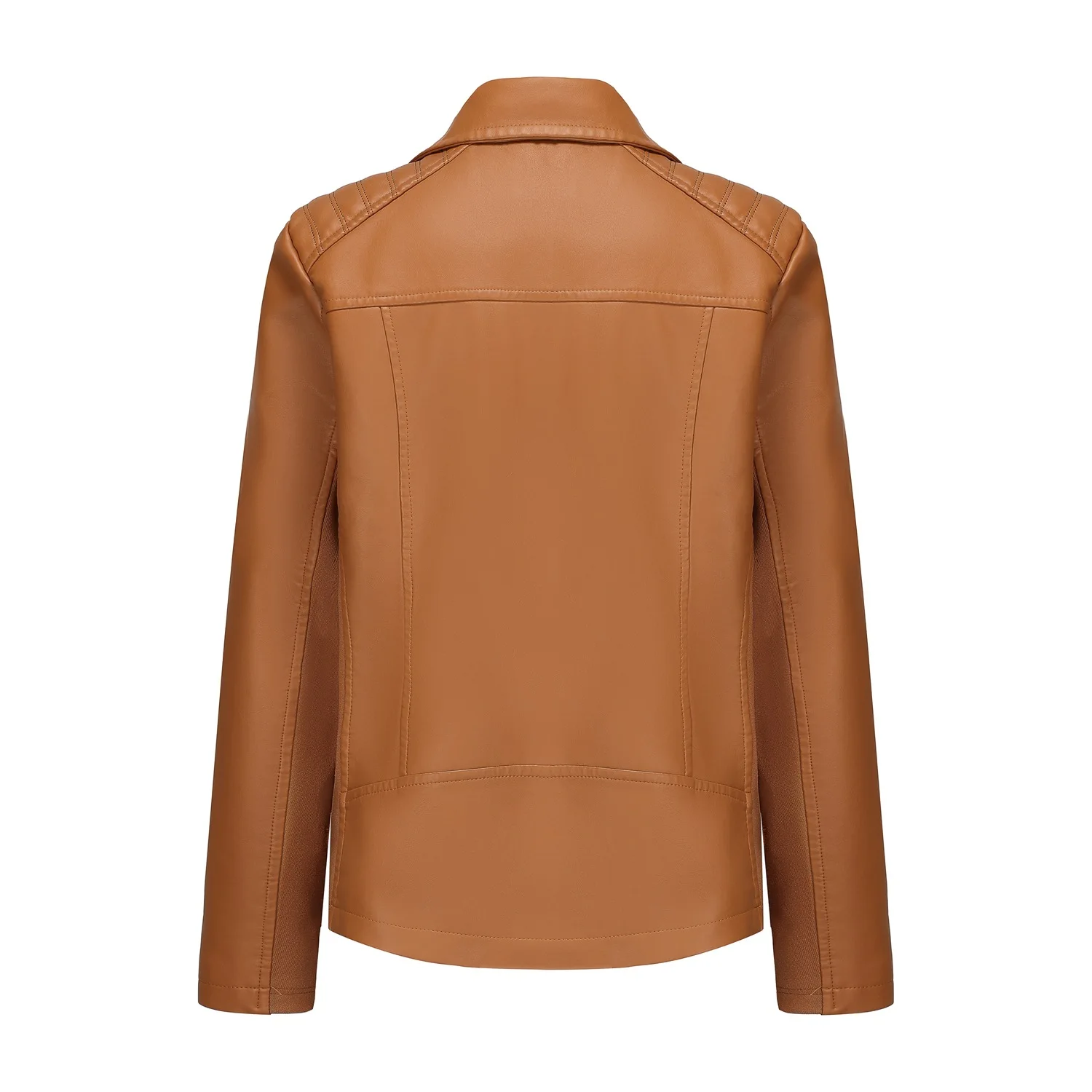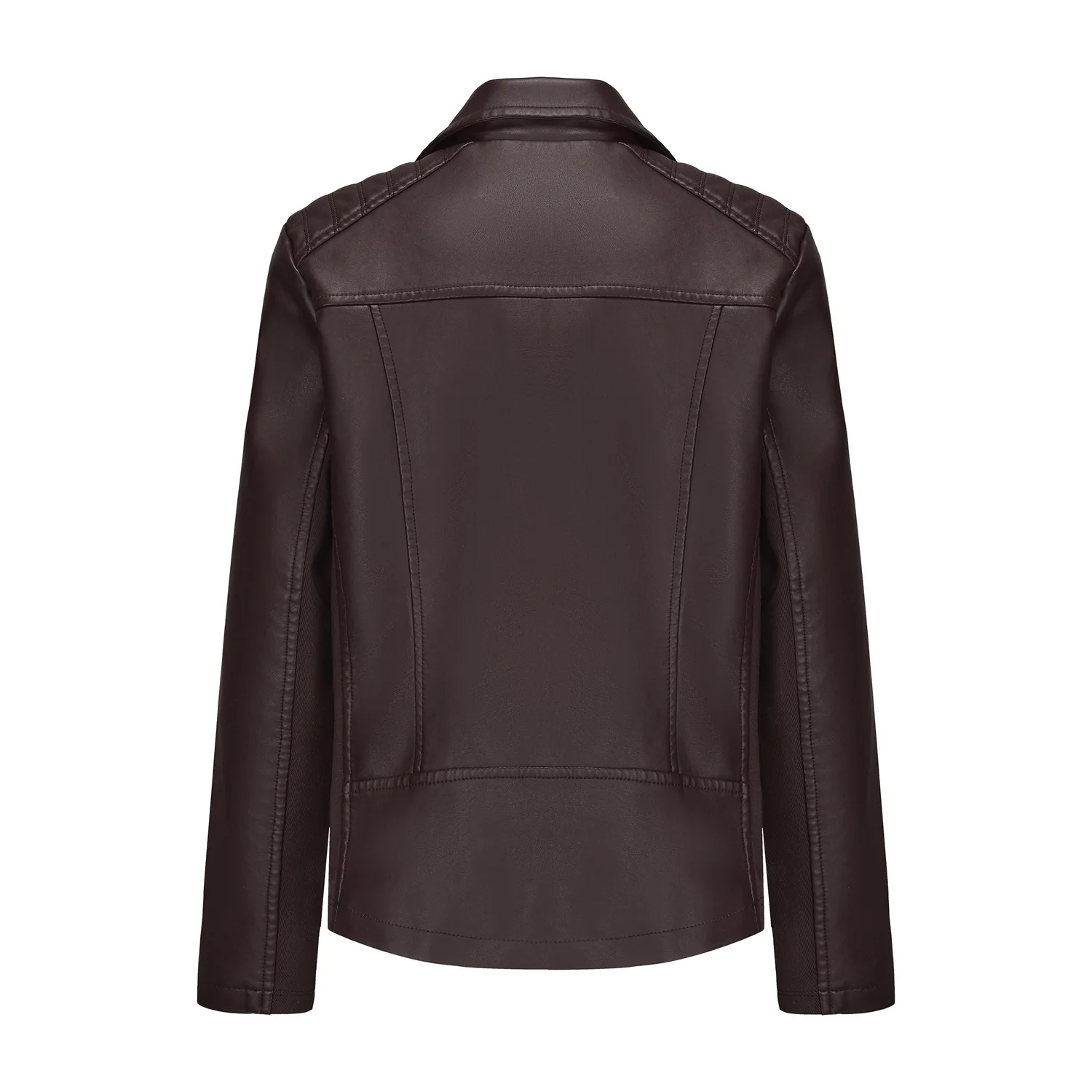 2025 Women’s Stylish Brown Faux Leather Jacket - Slim Fit, Trendy Moto Style with Zipper Detail PU Coat.