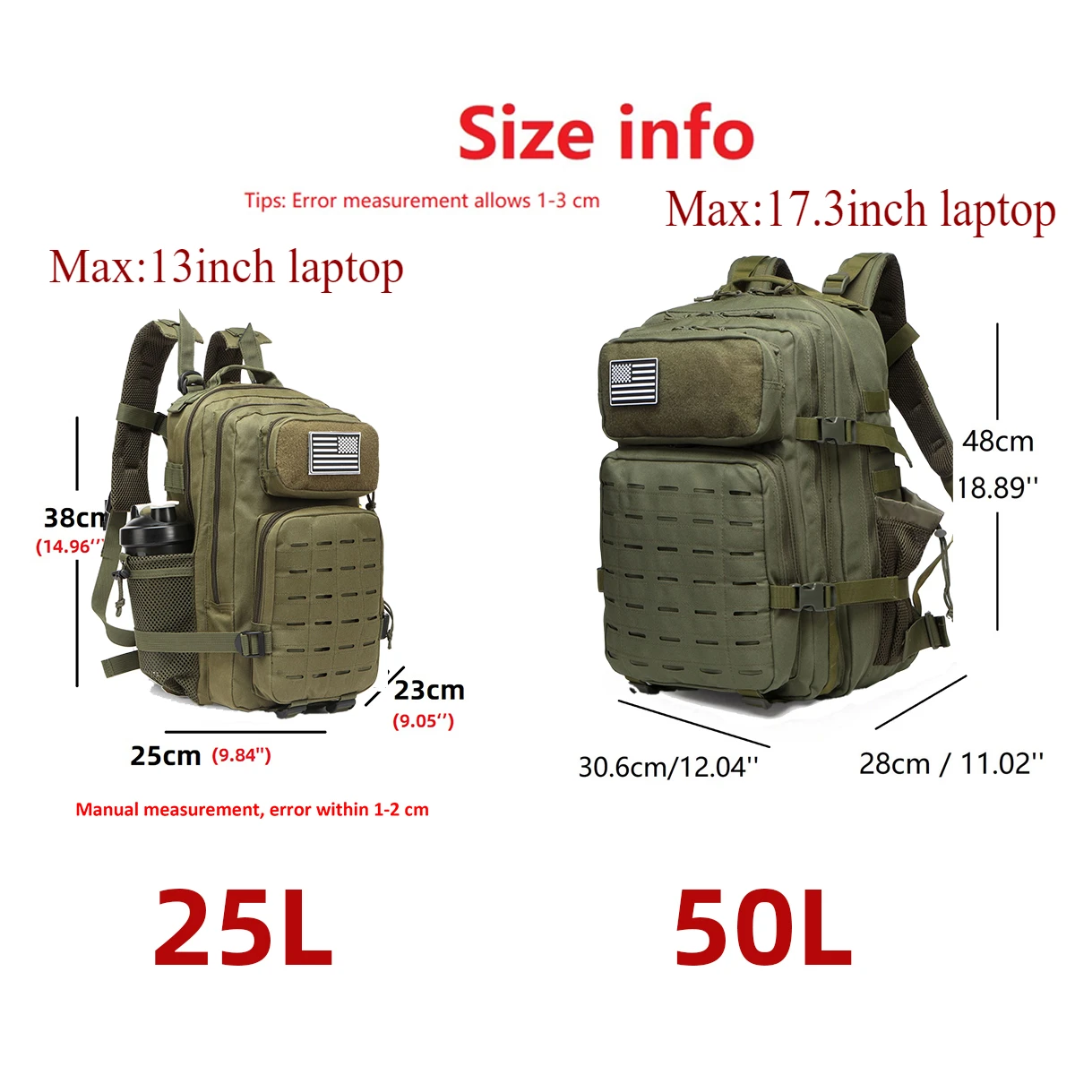 25L/50L Tactical Backpack Bag Hunting MOLLE Backpack GYM For Men EDC Outdoor Hiking Rucksack Witch 2 Bottle Holders