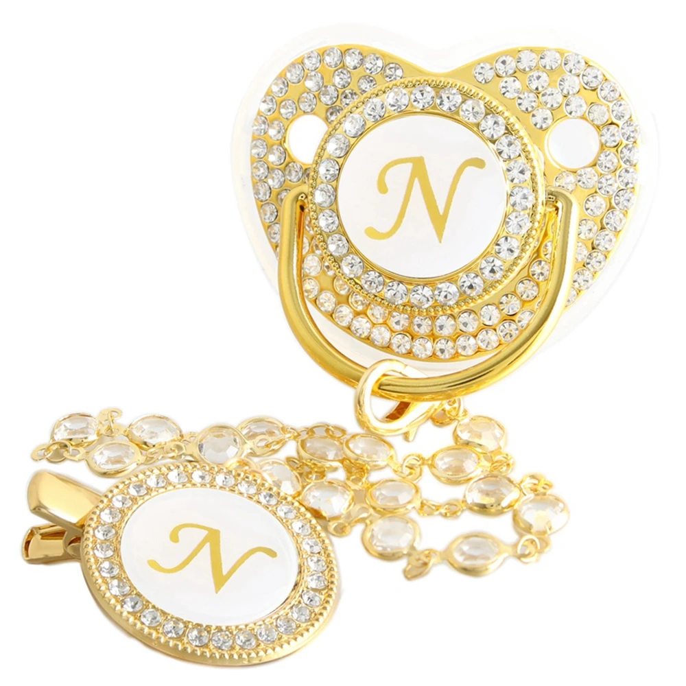 26 Initial Letters Golden Baby Pacifier With Diamond Chain Clip