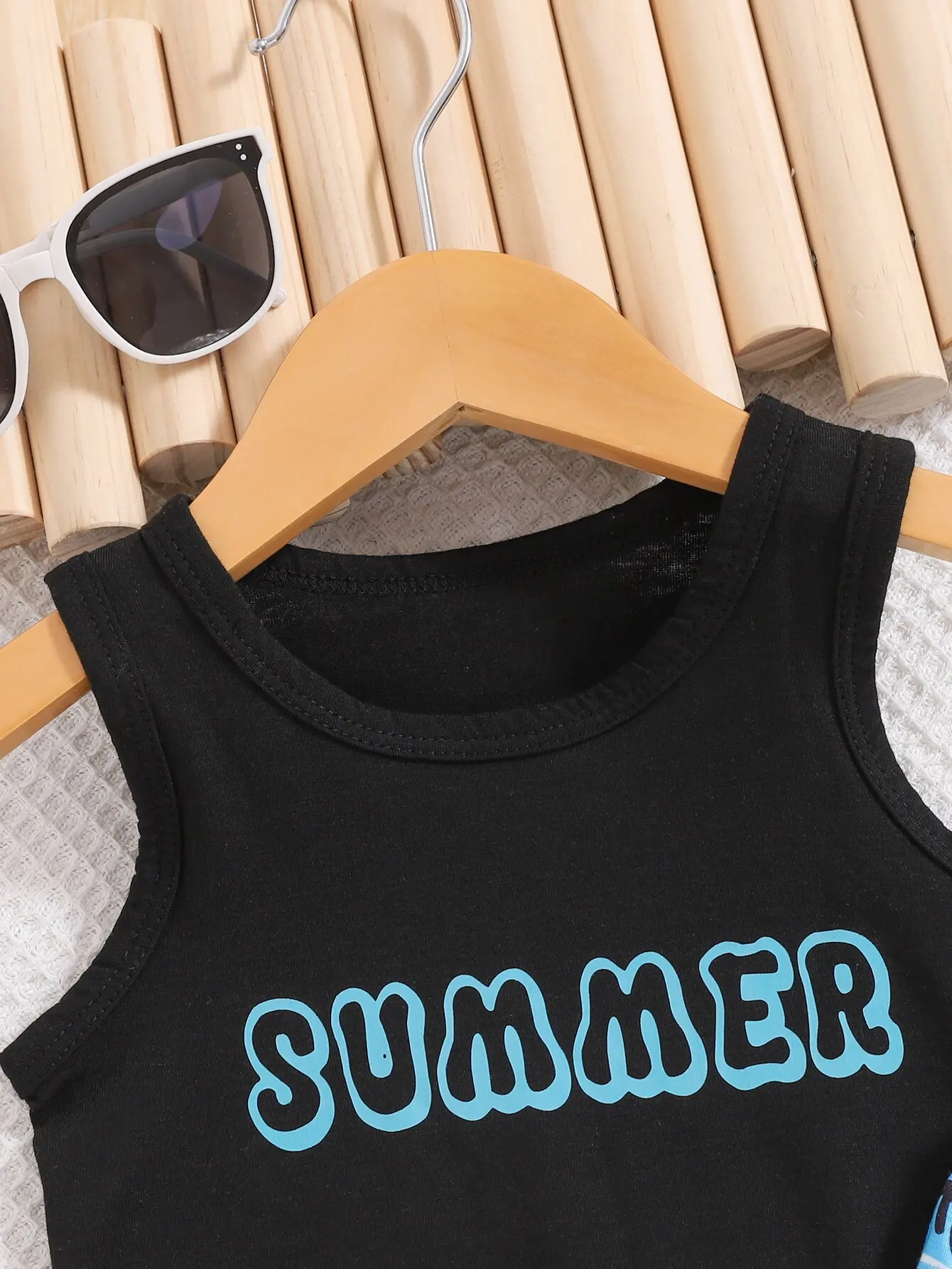 2pieces-Summer Baby Boy Casual Sports Outdoor Comfort Breathable Beach Vacation Travel Black Vest + Coconut Tree Printed Shorts