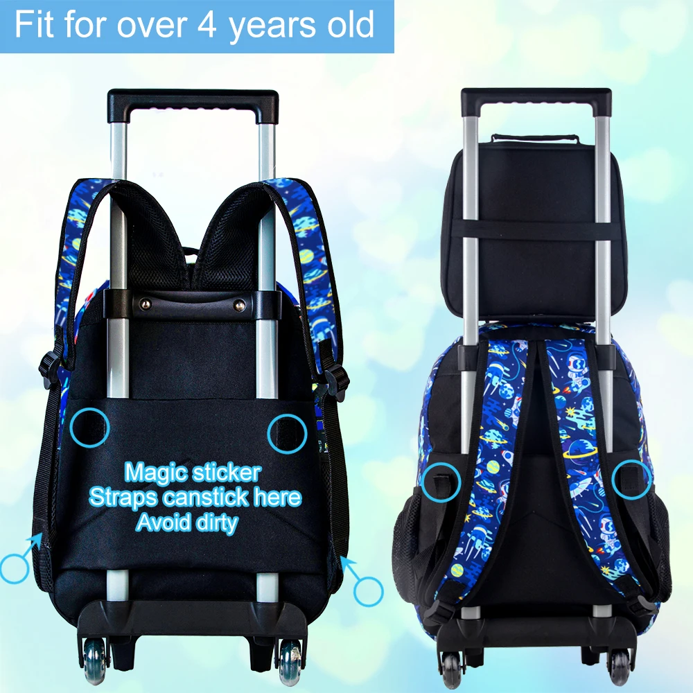 Fine Details: This astronaut rolling backpack has eye-catching reflective strip and premium water-resistant fabric, double zippers, all make this rolling school backpack more cherish for your boys.
