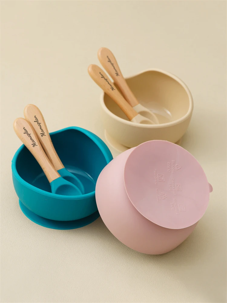 3PCS Custom Baby Feeding Set Spoon Fork BPA Free Silicone Suction Bowl For Toddlers Self Feeding Training Children's Tableware