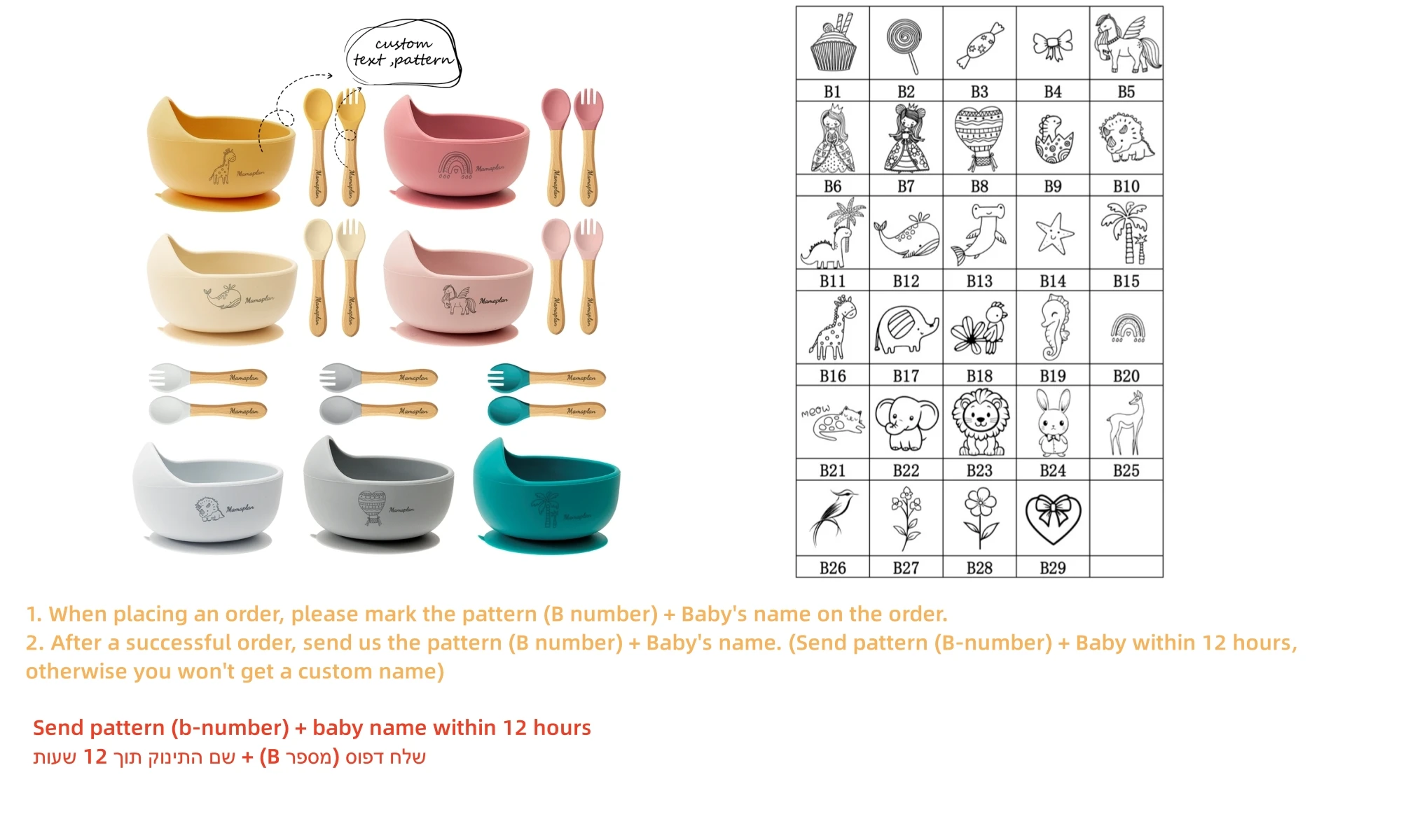 1. When placing an order, please mark the pattern (B number) + Baby's name on the order.