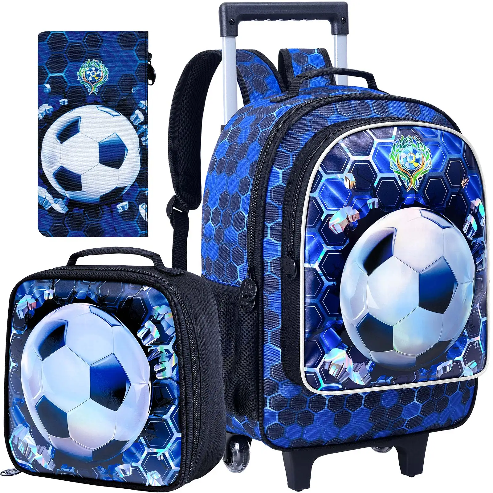 3PCS Rolling Backpack for Boys, Soccer Roller School Bookbag with Lunch Bag, Football Wheeled Backpacks for Teens Boys Elementar