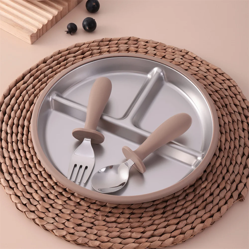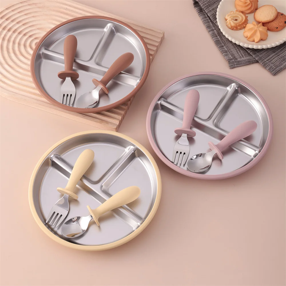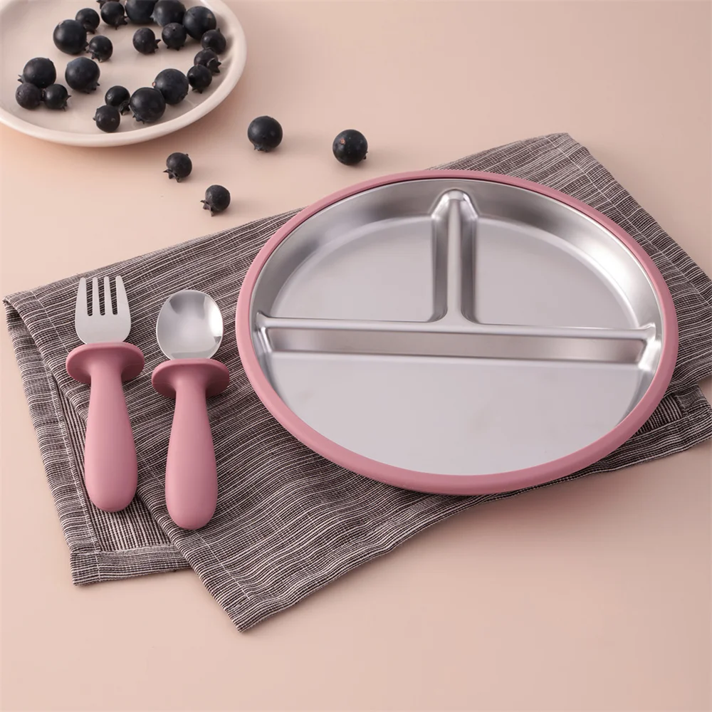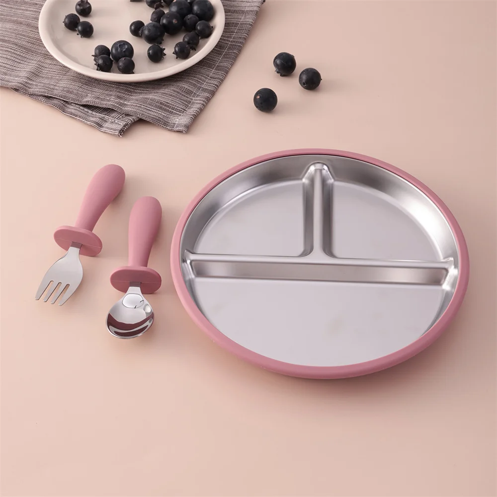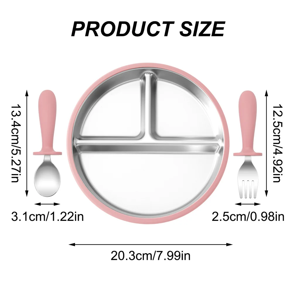 3PCS Silicone Stainless Steel Feeding Kit Toddler Sucker Feeding Dishes Plate Infant Self Feeding Training BPA Free Fork Spoon