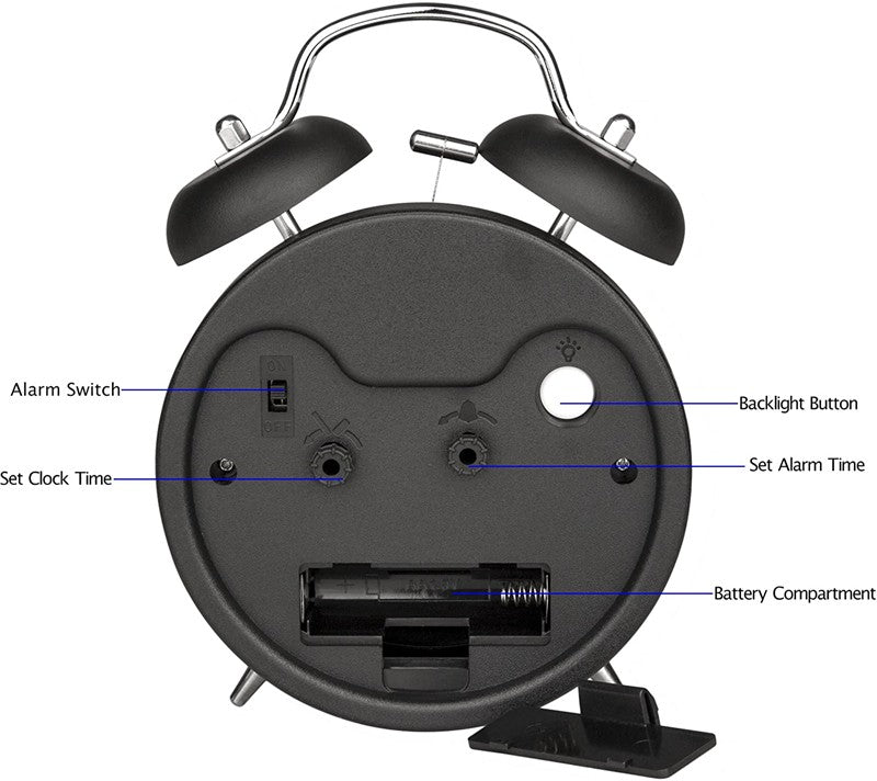 Simple modern design analog alarm clock in matte black finish. High quality metal bells, hammer, legs and frame are solid enough to withstand daily handling.