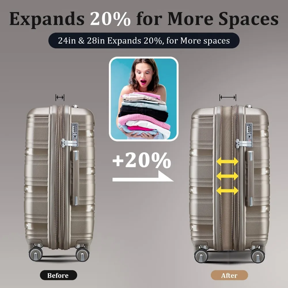 Sure, here's the description without the brand name, warranty information, chemical substances, special symbols, and in plain English: - 20% Extra Space with Expandable Design: The 24" and 28" checked suitcases expand for 20% more packing capacity, perfect for souvenirs. The carry-on fits all overhead bins, while the 14" mini case is ideal for weekend getaways. - TSA Locks and Military-Grade Security: TSA-approved combination locks allow agents to inspect without breakage. The suitcases are reinforced with double-layered anti-burst zippers and scratch-resistant textured shells to protect valuables in transit. - Aerospace Aluminum Handle (2x Stronger): The telescopic handle withstands 100 lbs, 66% higher capacity than standard luggage. Side grip handles let you easily lift suitcases onto trains, buses, or hotel stairs. - Silent 360° Spinner Wheels: Double spinner wheels rotate smoothly on various surfaces. Noise reduction technology makes them 50% quieter than basic single-wheel designs, eliminating loud rattling in airports. - Smart Organization System: The interior features cross-compression straps and dual zippered compartments to separate clean/dirty clothes. The material is waterproof and wipes clean in seconds after rainy adventures.