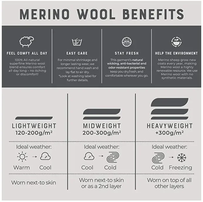 4.Enjoy the no-odor, anti-microbial, fire resistant, moisture wicking, and long wearing comfort of merino in every aspect of your life.