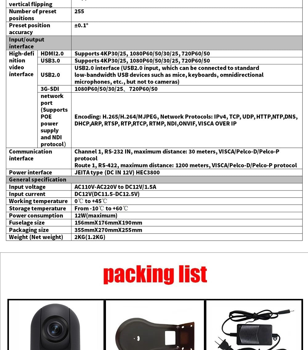The camera features a full suite of interfaces, enabling simultaneous output via HDMI, 3G-SDI, USB3.0, and IP. It can deliver videos at a maximum resolution of 4K@60fps or 1080p@60fps, while supporting multiple advanced technologies like NDI, PoE, RTSP, RTMP, and SRT, catering to various professional video production and transmission requirements.