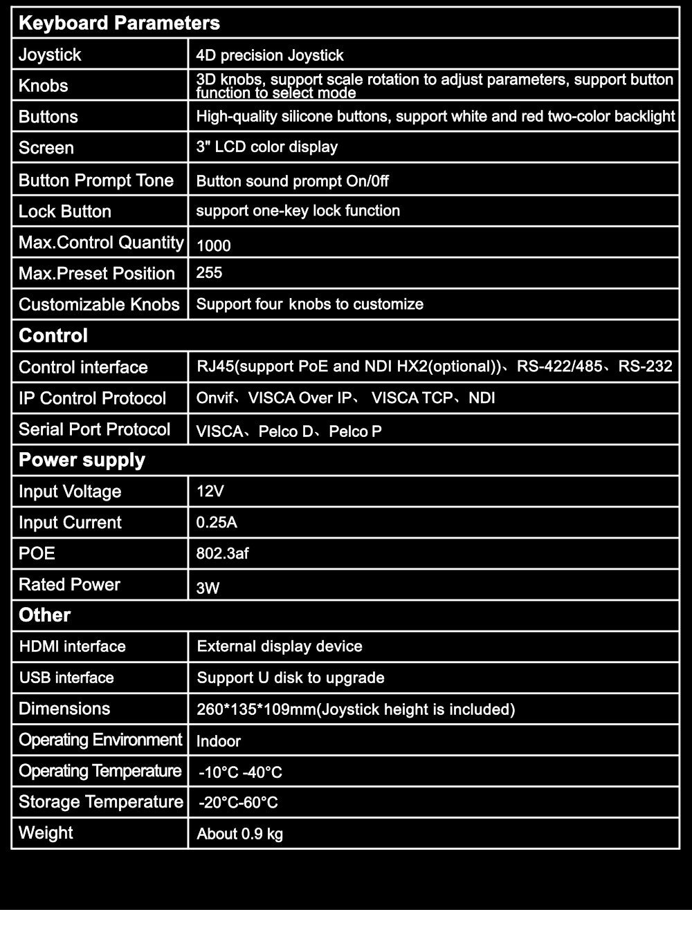Users have the flexibility to control the camera through multiple interfaces, including RS232/485/RS422, network IP control, as well as industry-standard protocols like VISCA (including VISCA Over IP), PELCO P/D, and ONVIF, facilitating easy integration into different control systems.
