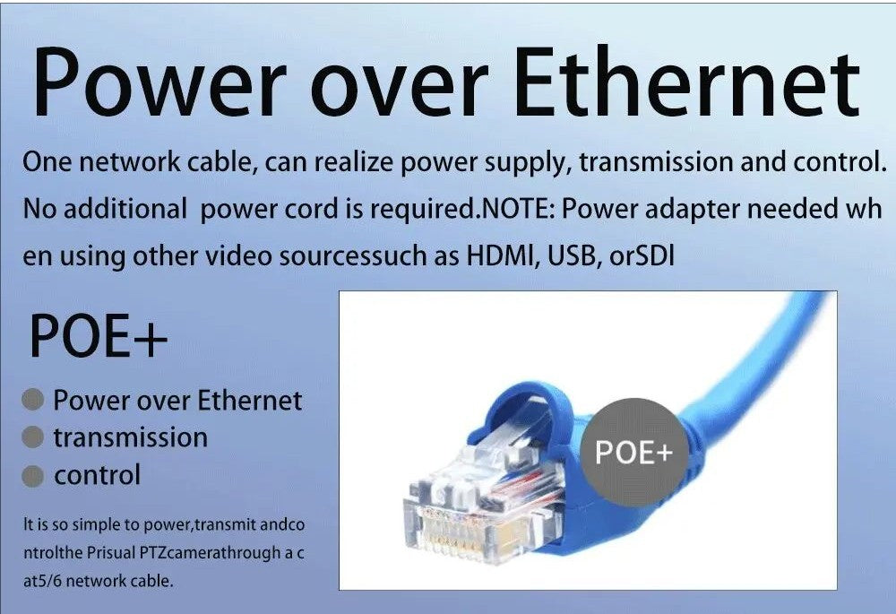 The PoE feature allows the camera to receive power and transmit data simultaneously through a single Ethernet cable, eliminating the hassle of laying additional power cords. However, it's important to note that when using alternative video sources like HDMI, USB, or SDI, a power adapter is required.