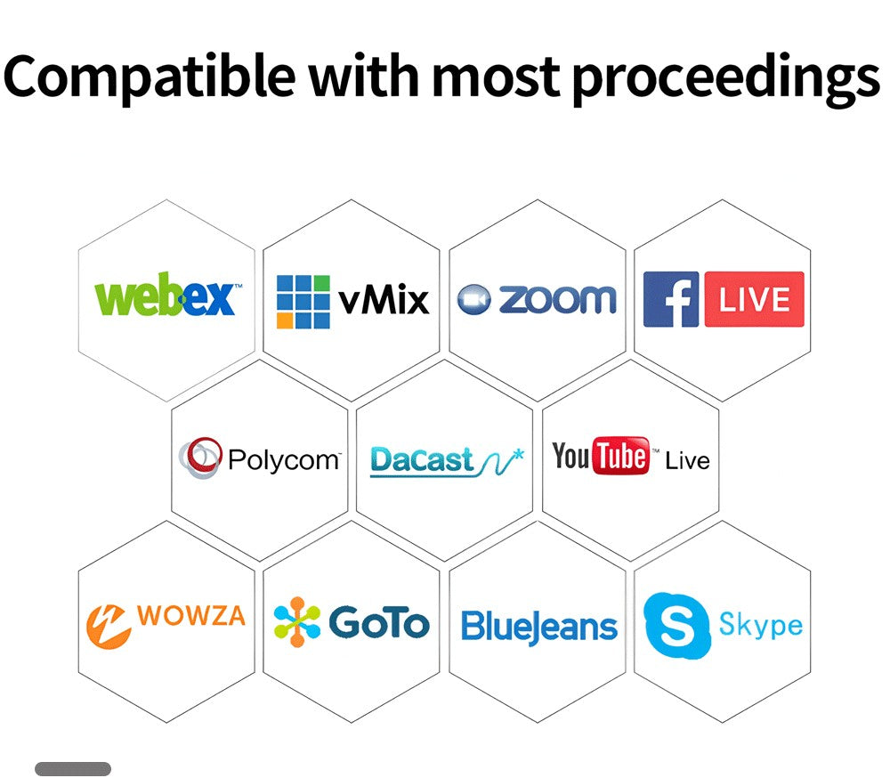 It is fully compatible with a wide array of popular video/conference software, such as Zoom, Skype, YouTube, Facebook Messenger, Teams, Facetime, Google Hangout, OBS, Google Meet, and more. Additionally, it supports various operating systems including Windows 7/8.1/10, Mac 10.10, Linux, Android, and higher versions, ensuring seamless integration into different digital ecosystems.