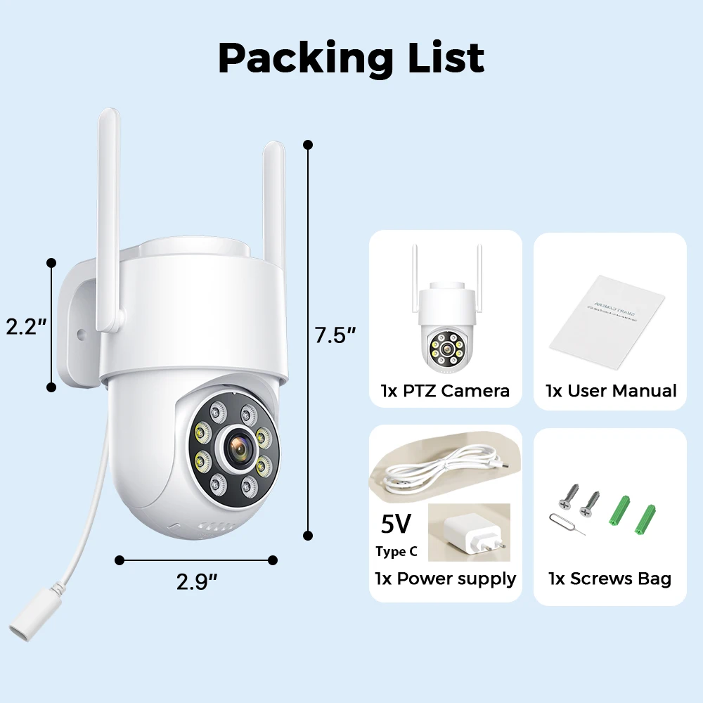 The power supply of the WiFi camera is 5V USB-Type C type, without RJ-45 LAN Cable Port, which is more energy-efficient and cost-effective