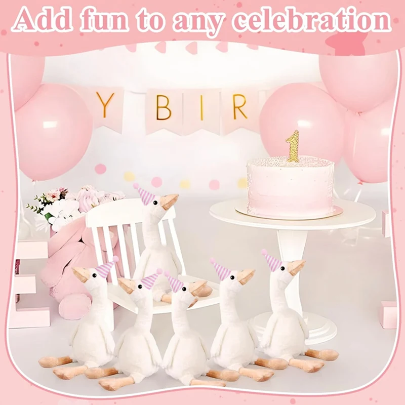 Your purchase includes 6,10 or 16 adorable goose stuffed animal companions (11.8" tall),pair with pink mini birthday hats, blue mini birthday hats.