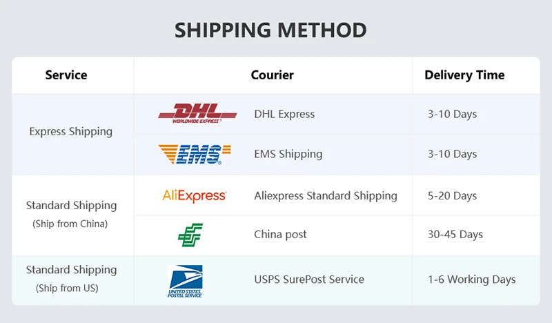 1.If you choose to ship from China, we ship by the AliExpress Standard Shipping; if you choose to ship from overseas warehouses, we will ship by the local logistics delivery.