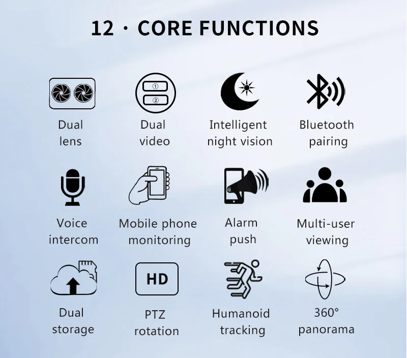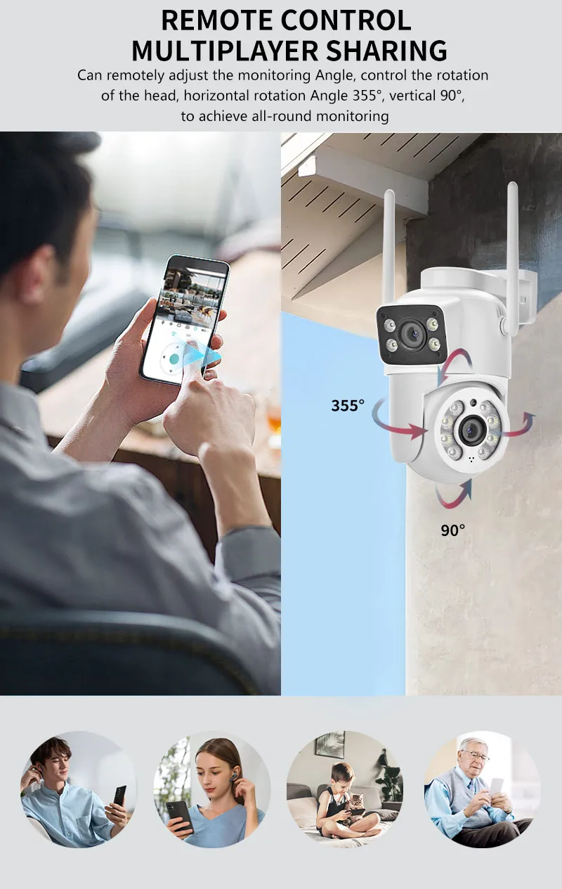 Dual lens, Dual screen, Notifications alarm, humanoid tracking, two way voice intercom 360 monitoring, full color night vision, IP66 waterproof, mobile phone remote monitoring?Share video, SD card storage, 24 hours video recording