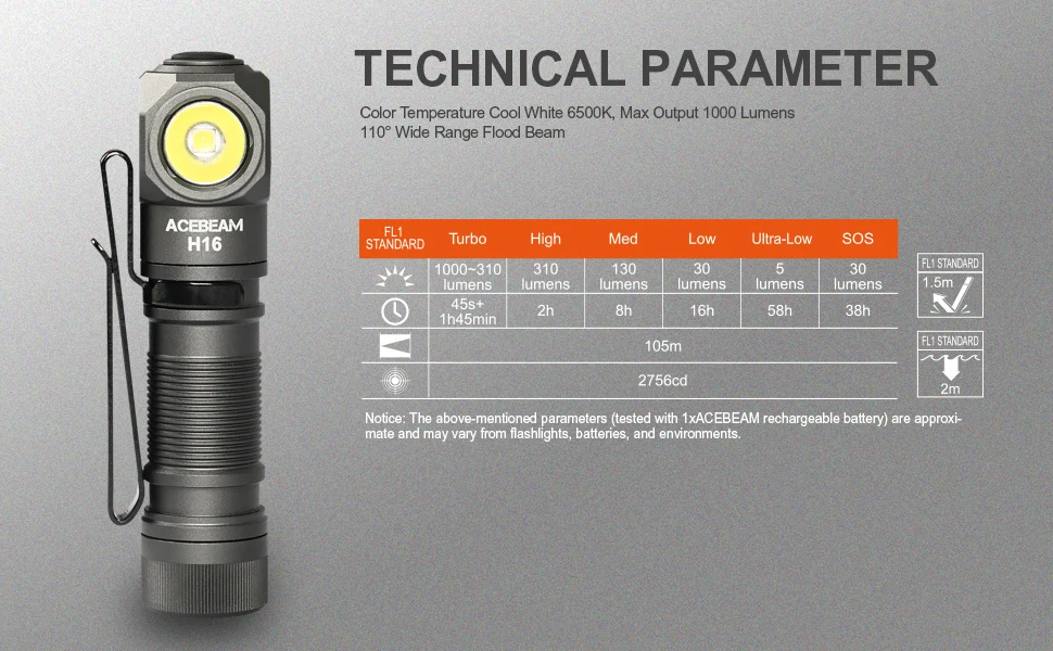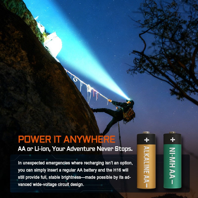 Powered by a wide-voltage system (1.2–4.2V), the H16 supports both standard AA batteries and rechargeable lithium cells, giving you unmatched flexibility in different environments. In unexpected emergencies where recharging isn’t an option, you can simply insert a regular AA battery and the H16 will still provide full, stable brightness—made possible by its advanced wide-voltage circuit design.