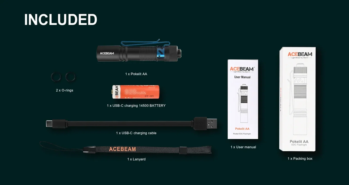 4,Powered by 1 piece ACEBEAM customized 14500 Li-ion rechargeable battery which is with an build-in USB-C charging port.