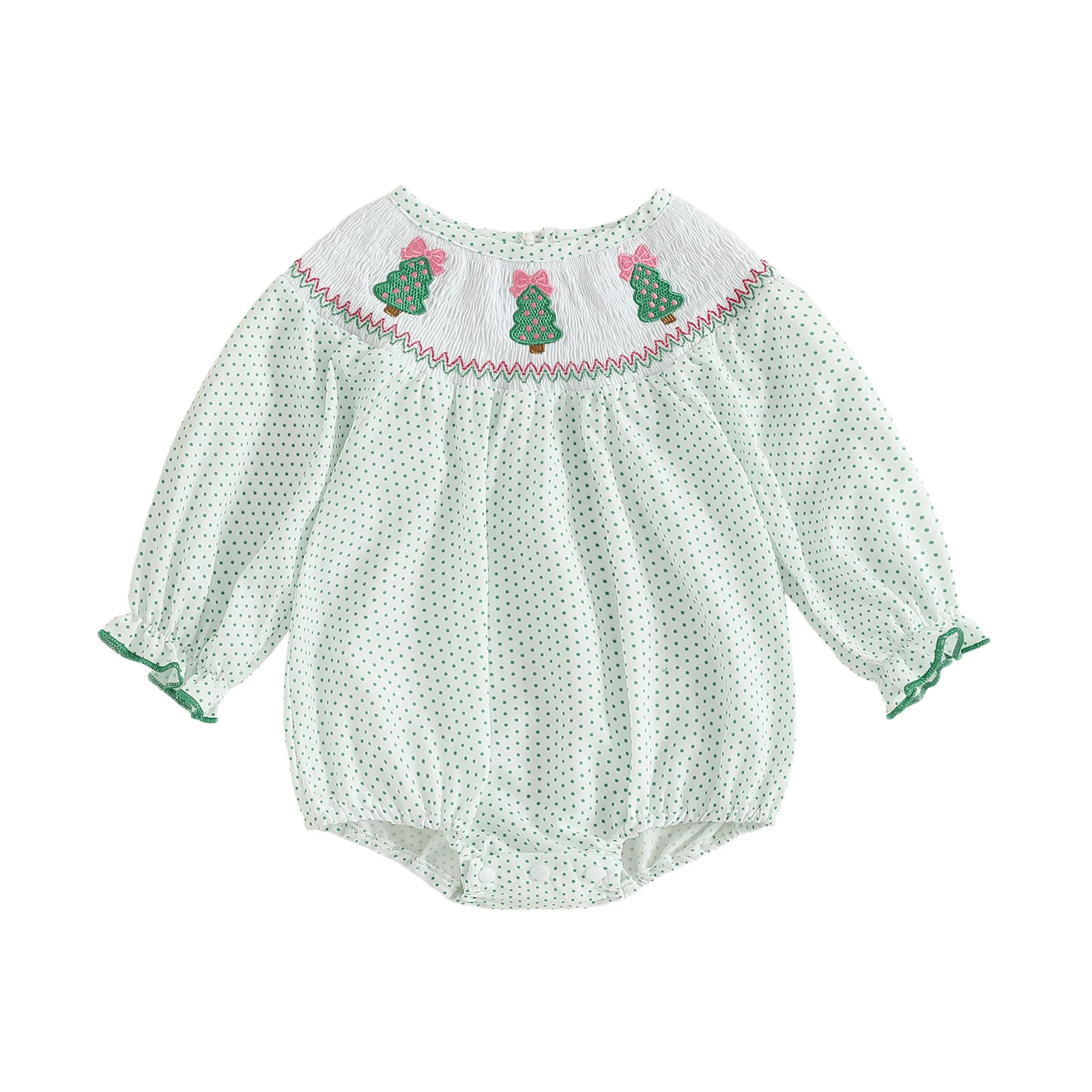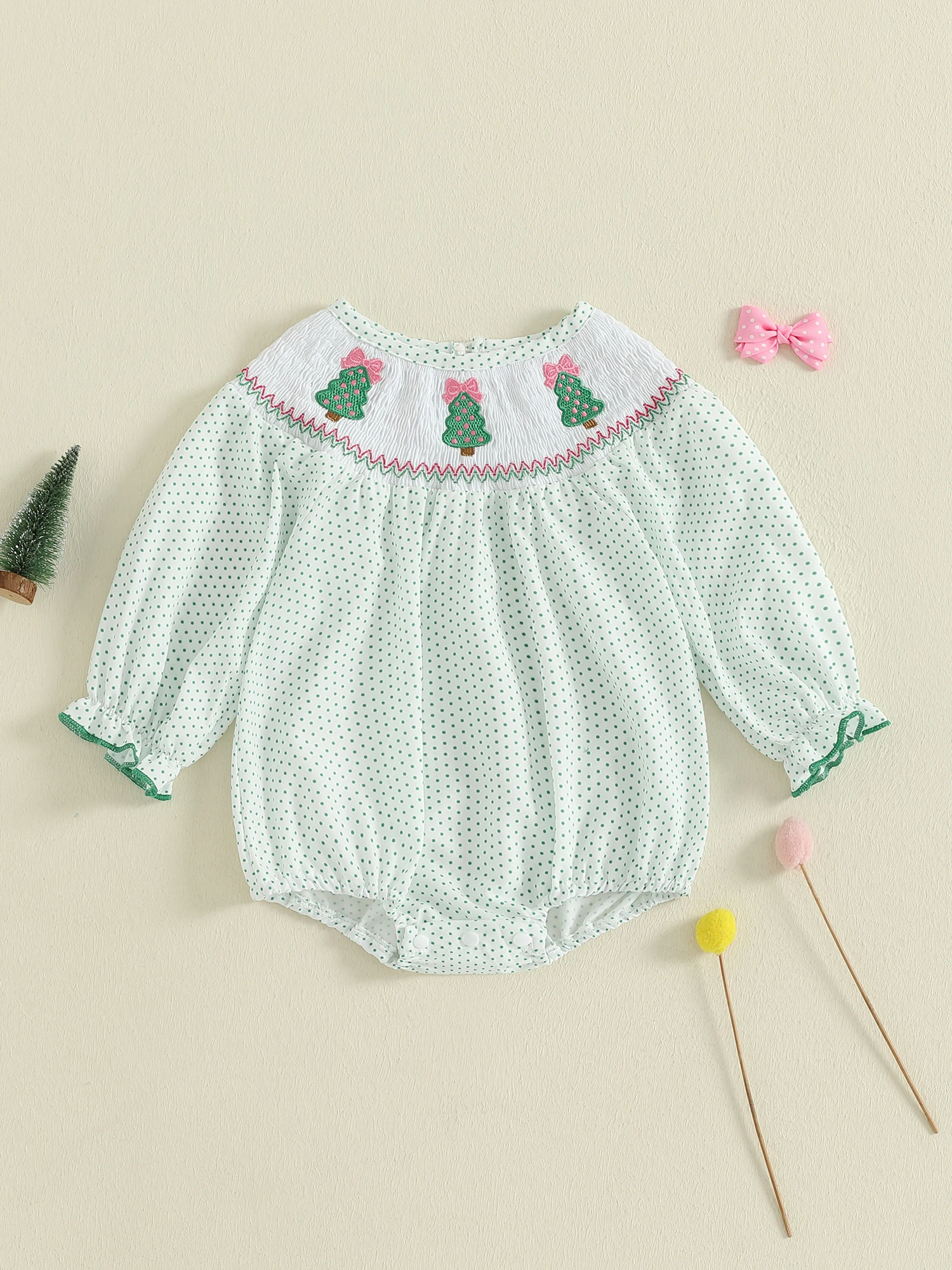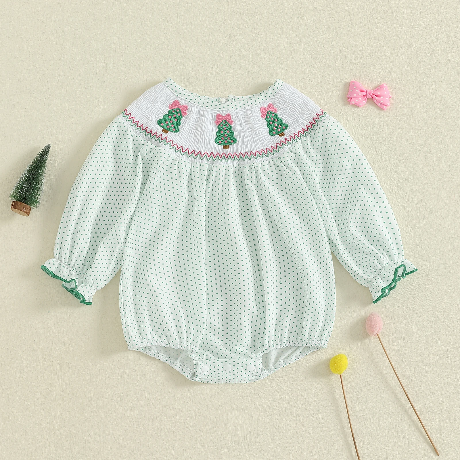 Christmas Infant Baby Girls Rompers Cute Long Bubble Sleeve O Neck Dot Print Tree Embroidery Jumpsuit