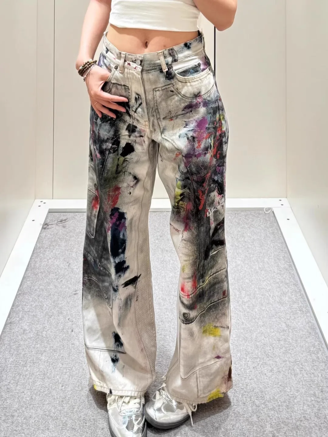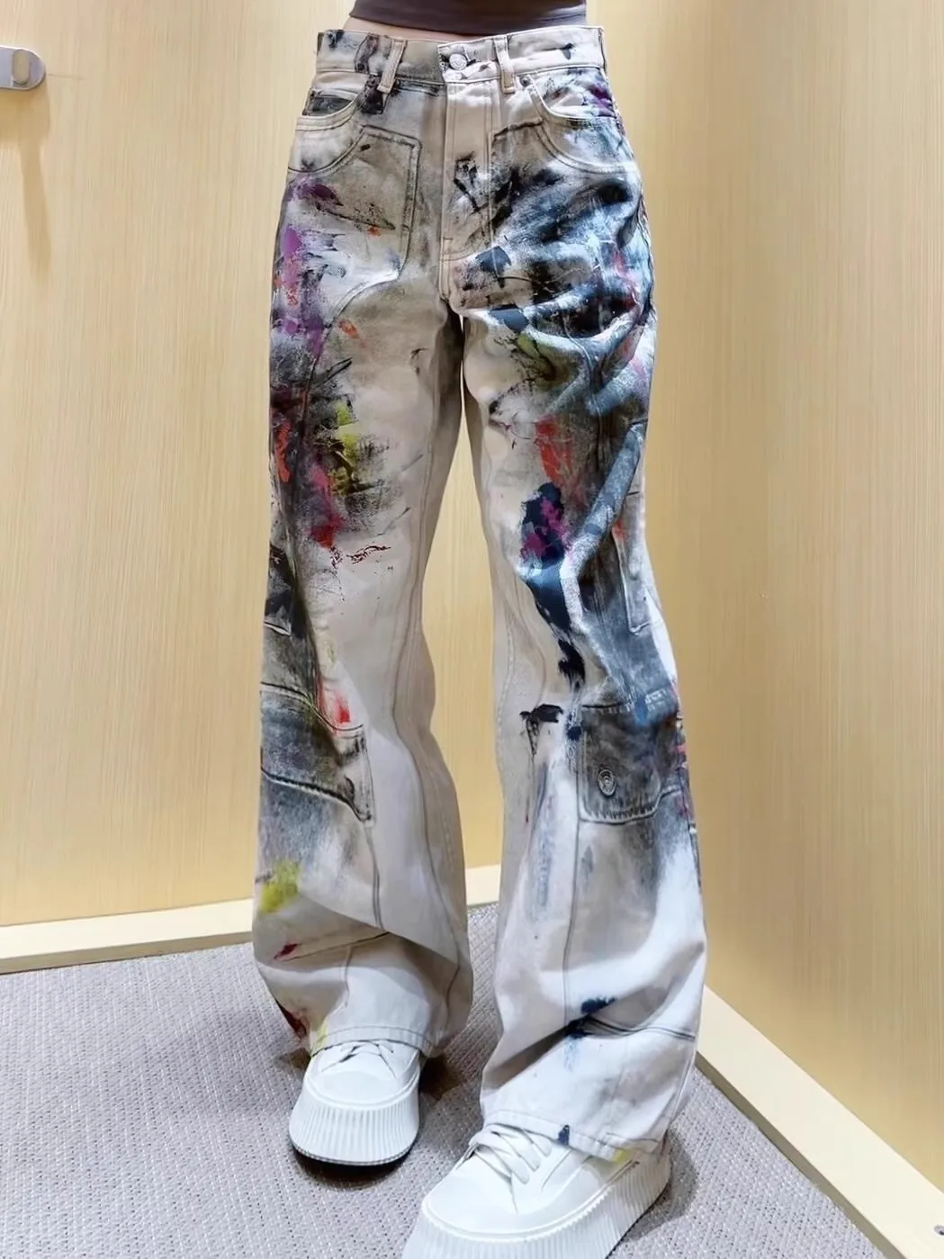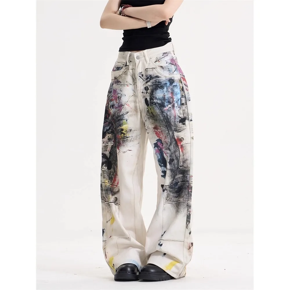 American vintage graffiti 3D printed jeans for women high street Y2K style loose straight-cut casual wide-leg floor-length pants