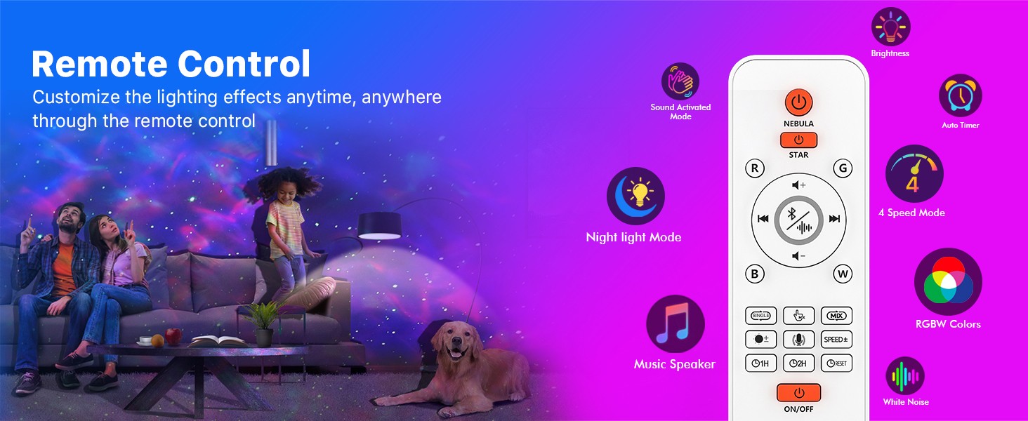 4-IN-1 STAR PPROJECTOR NIGHT LIGHT: AURORA LIGHTING star projector combines a projector, nightlight lamp, white noise machine, and music player in one device, creating an extraordinary audio-visual experience. It features 14 vibrant colors that project shining stars and mesmerizing nebula clouds, bringing the vast starry night sky indoors for you and your kids to enjoy a peaceful galaxy in the bedroom or kids' room. Experience the beauty of space in the comfort, creativity, and celebration of your home.