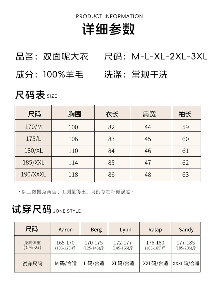 M?Bust100cm?Coat Length82cm?Sleeve Length59cm?Shoulder Width44cm?Recommended Weight52.5kg-62.5kg?Suitable for heights 165-170cm?