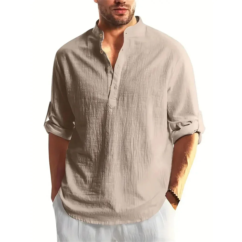 Autumn New Men's Cotton Linen Long Sleeve T-shirt Solid Color Henley Collar Lightweight Breathable Men's Casual Button Top