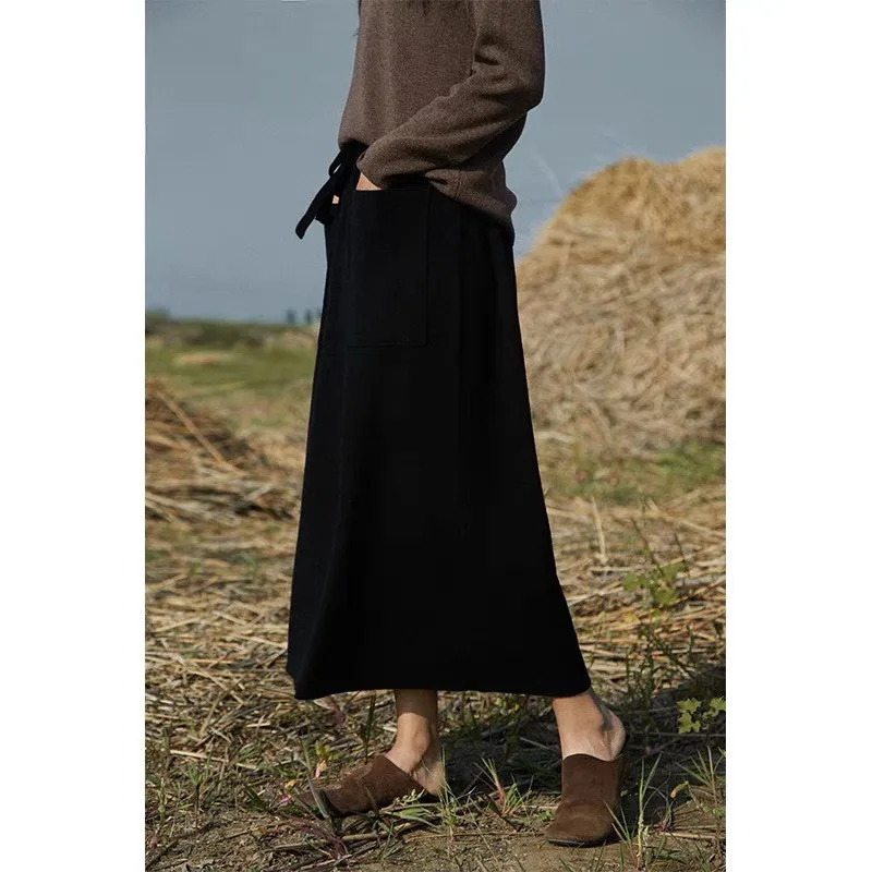 Autumn/Winter 2024 New Cashmere Double Pocket Retro Dress Art Style Versatile Women's Long Skirt