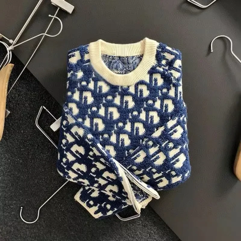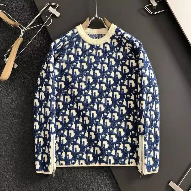 Autumn Winter CD Letter Full Print Embroidery Men's round Neck Knitted Wool Sweater Casual Long Sleeve Sweatshirt