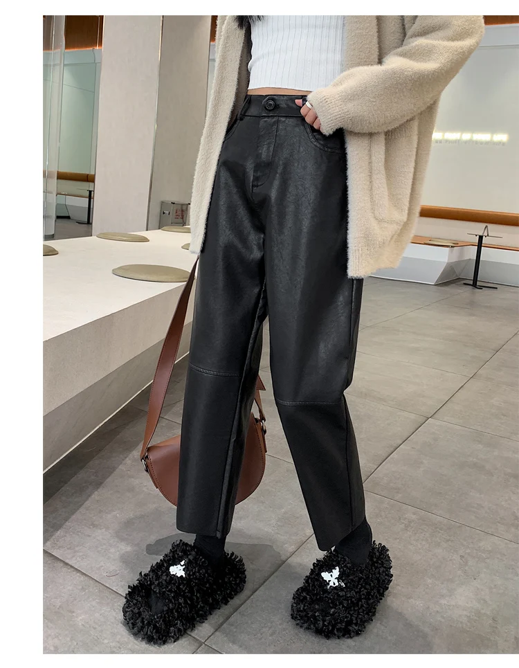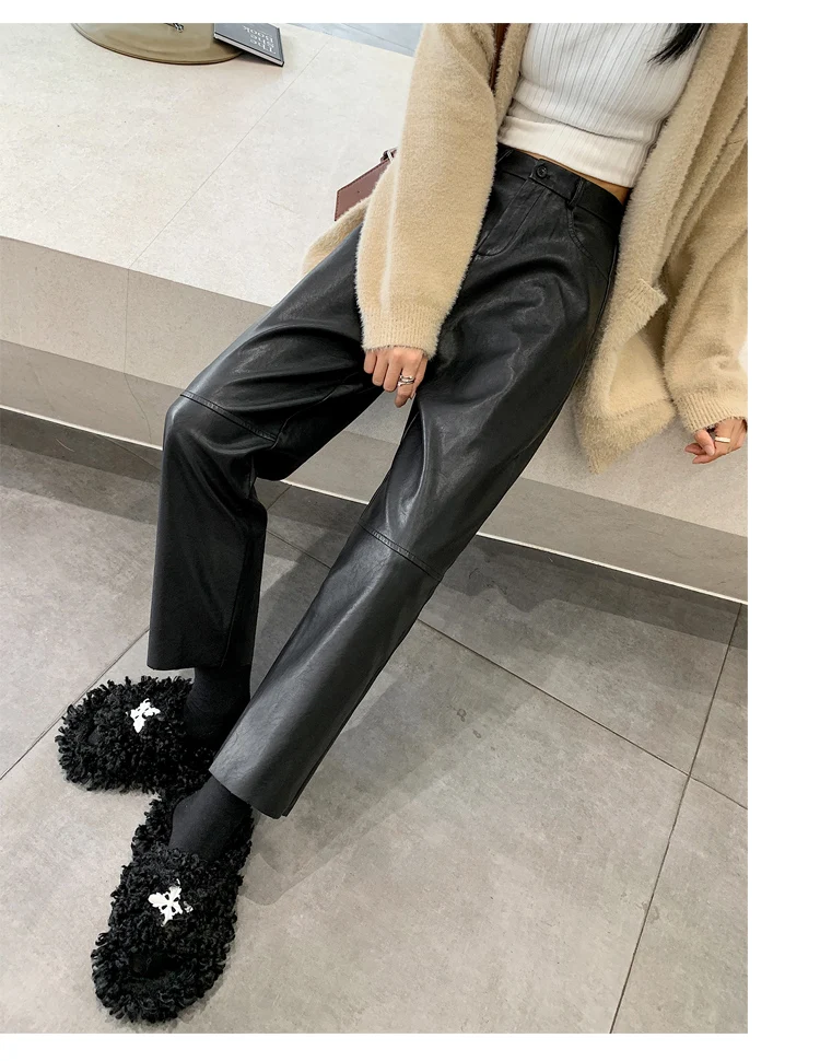 Autumn Winter PU Leather Vintage Women's Ankle Length Pants 2024 New High Waist Zipper Black Straight Pants Female Pockets