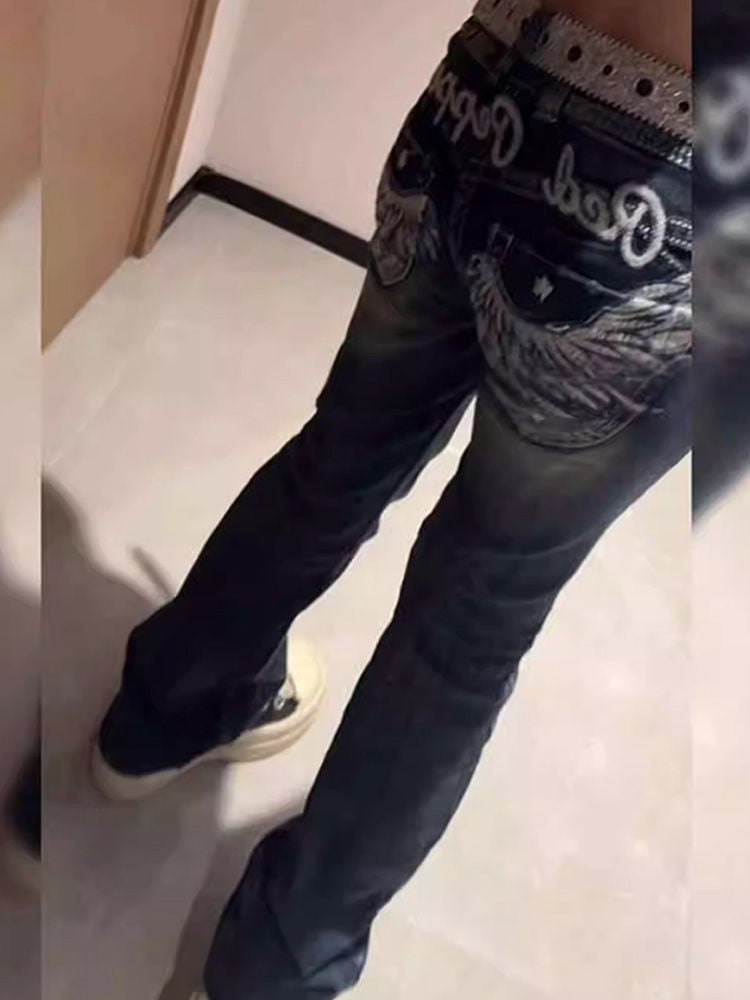 Autumn Y2K Fashion Retro Punk Low Waist Casual Embroidery Diamond Jeans Women Blue Wings Pattern Embroidered Leg Slim Pants 2025