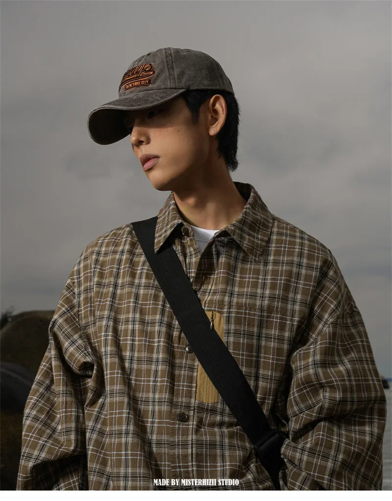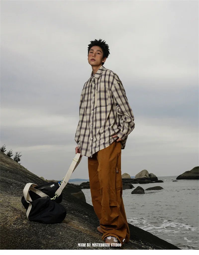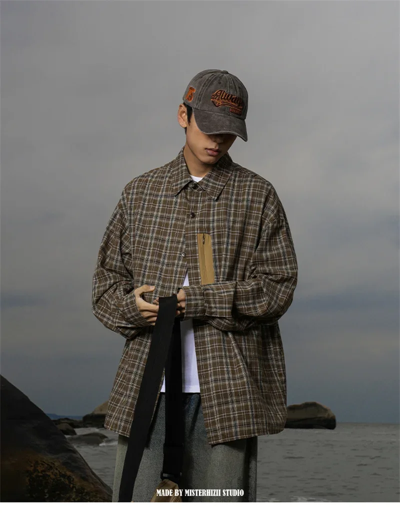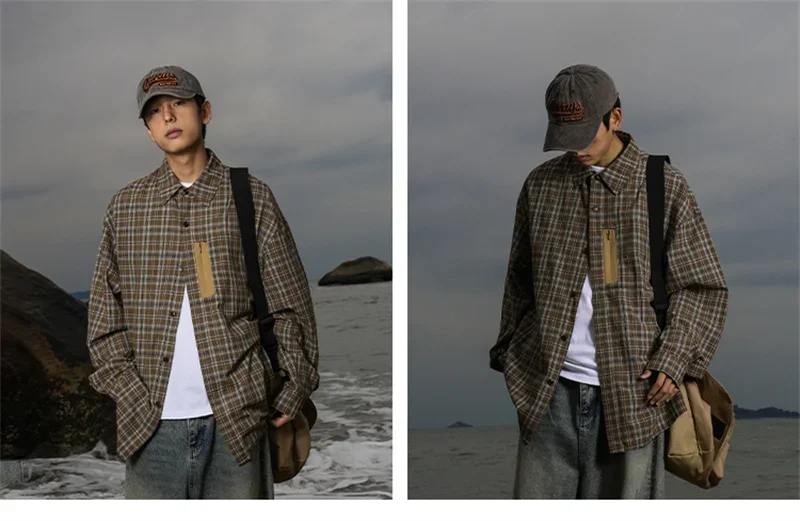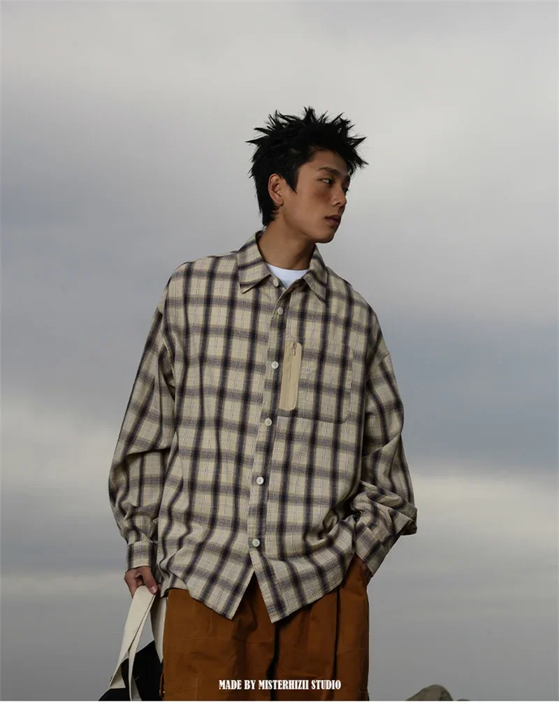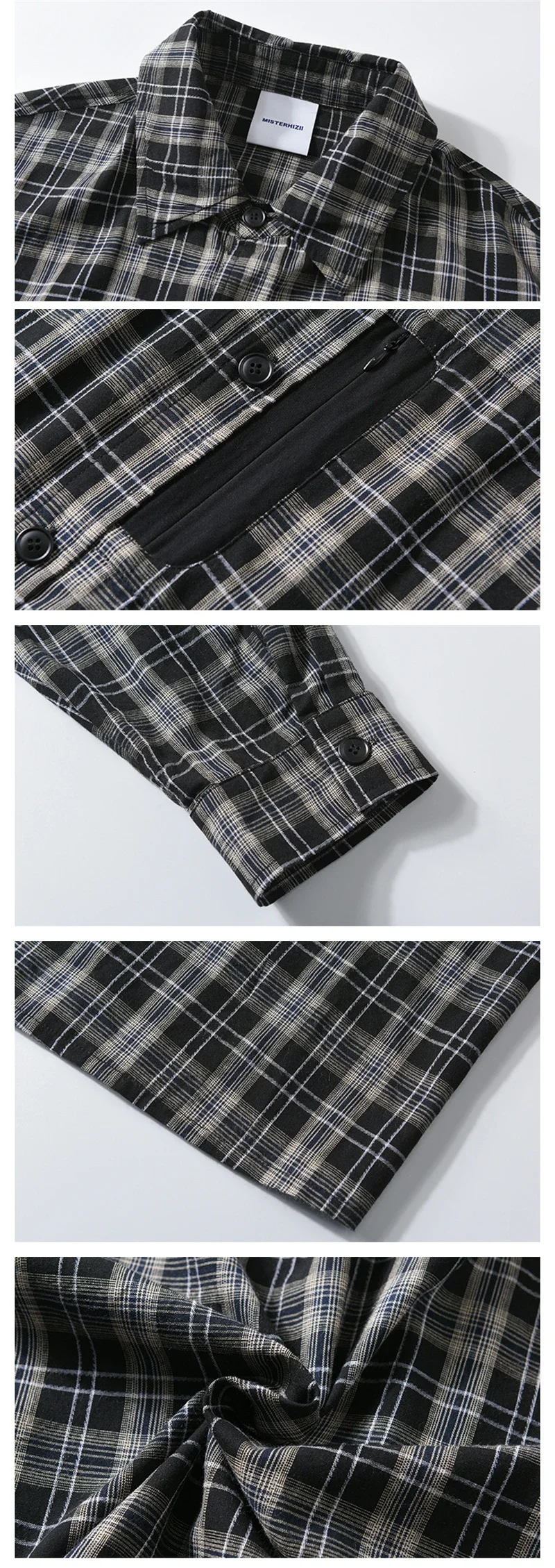 Autumn Y2K Vintage Plaid Shirts For Men Long Sleeve Button Up Blouse Korean Fashion Zip Pocket Cargo Shirt Streetwear Clothes