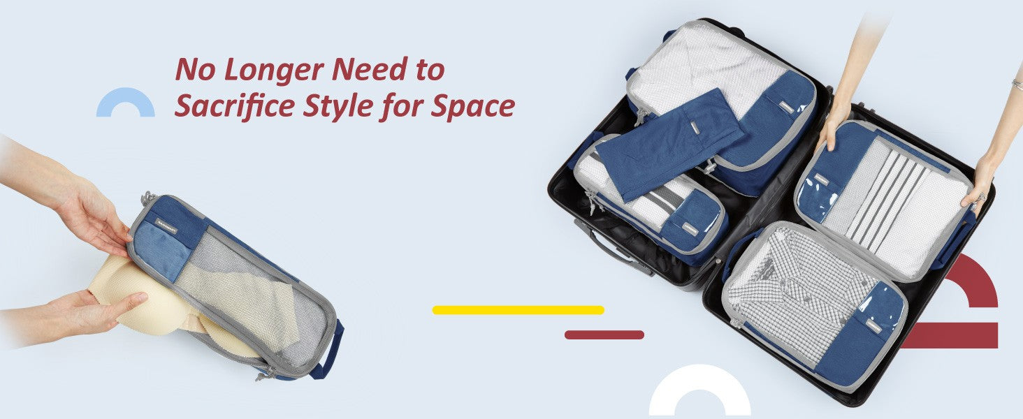 • True Space Saving - These compression travel cubes are kind of like how a vacuum sealer works. Done by adding an extra zipper around the outside that can be zipped up to help squash clothes down and minimize the space inside. It’s remarkable how much of a difference they can make. Help travelers “Fit Double the Amount” in their suitcases.