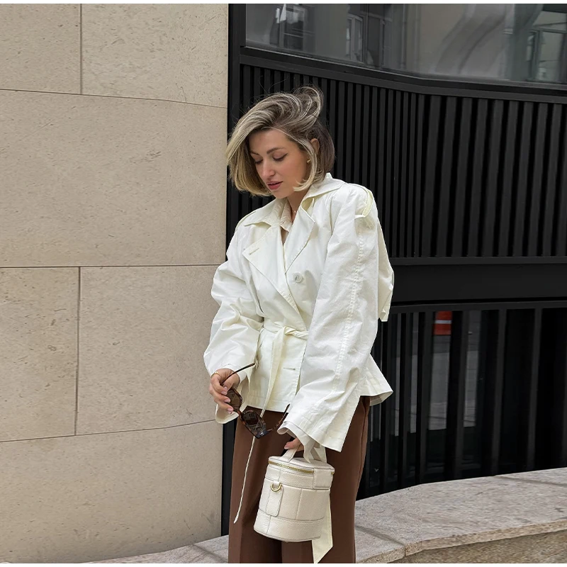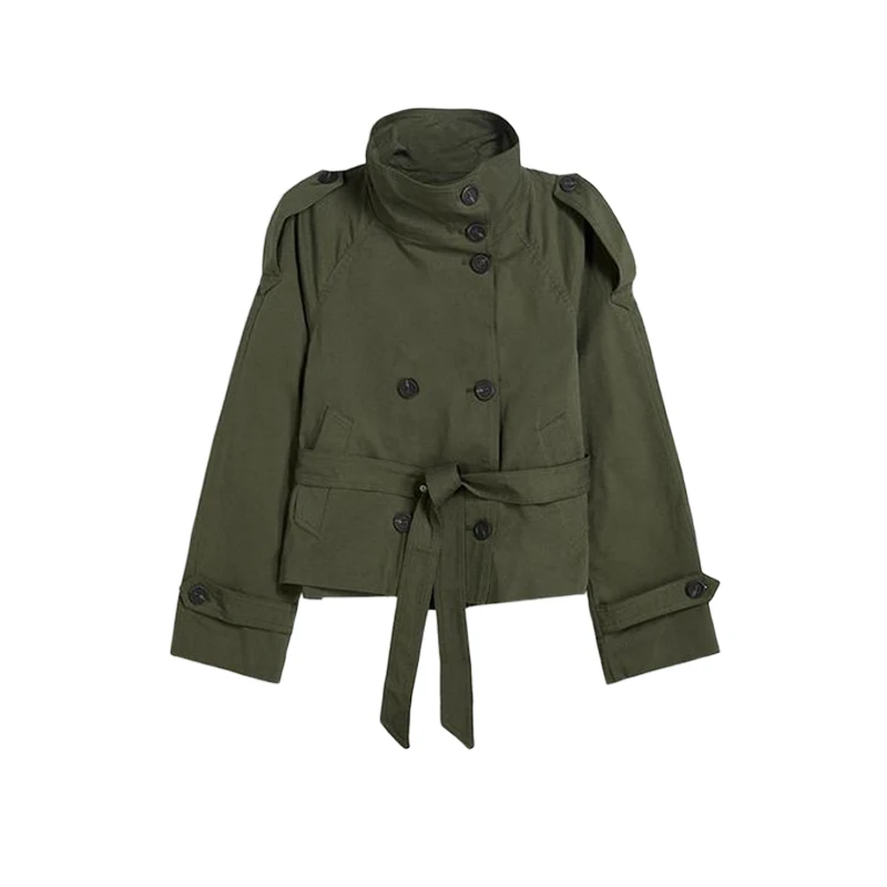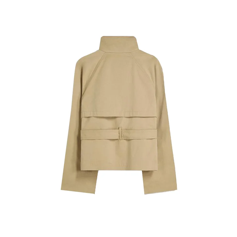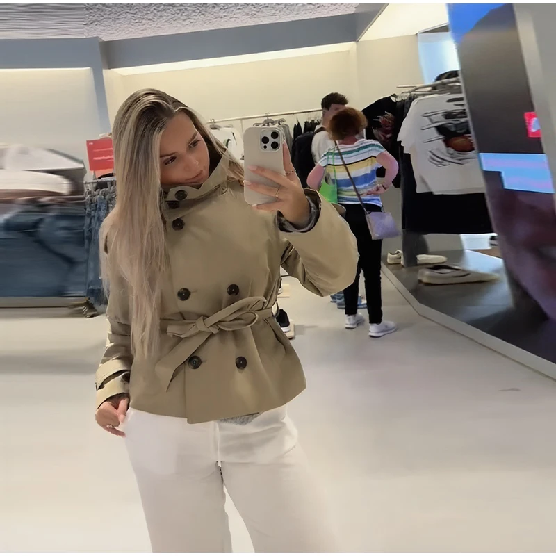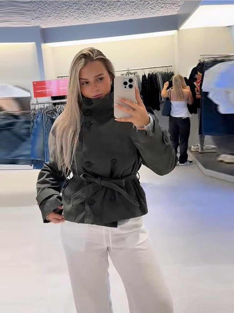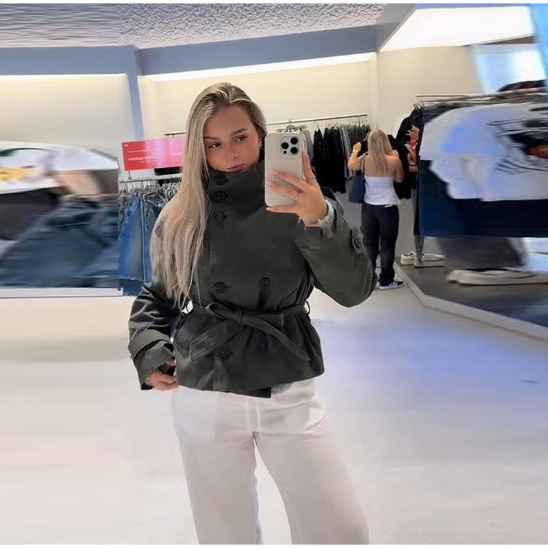 Belted Waist Cropped Trench Double Breasted Stand Collar 2025 Autumn Chic Elegant Women Coat Casual Vintage Office Lady Jacket