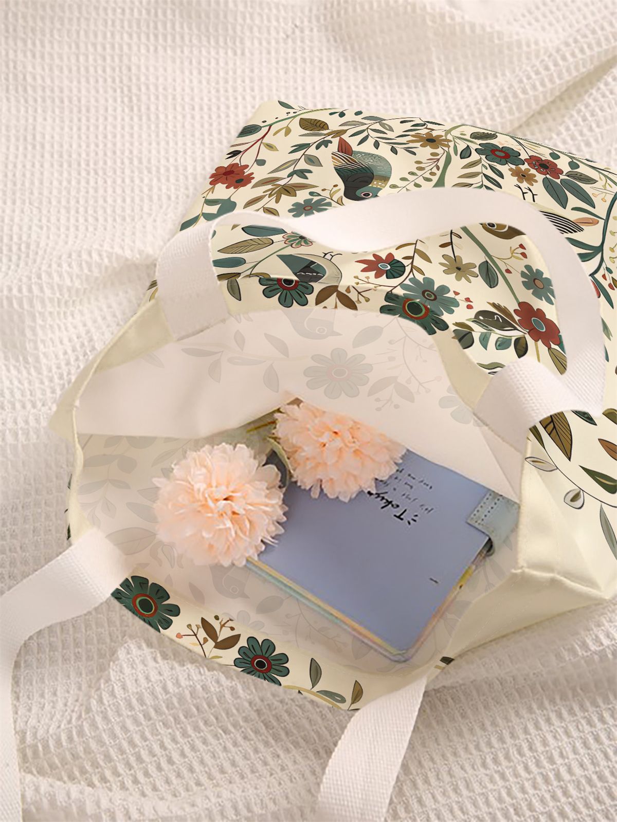 Bird and flower pattern printed casual handbag, reusable fashionable backpack, multifunctional handbag, canvas shopping bag