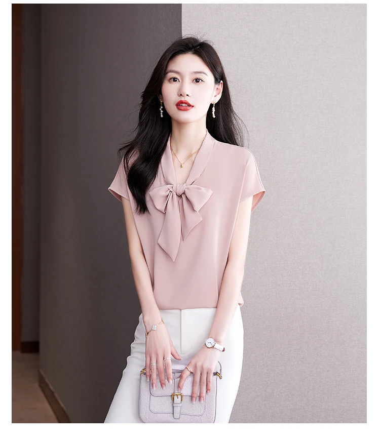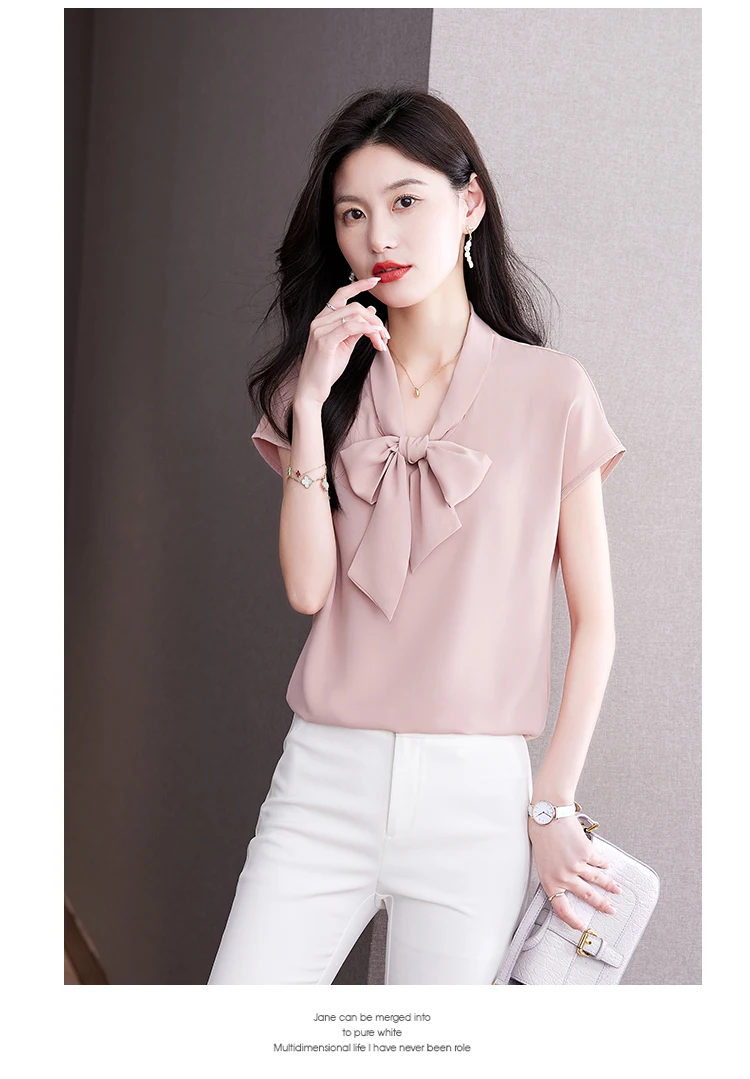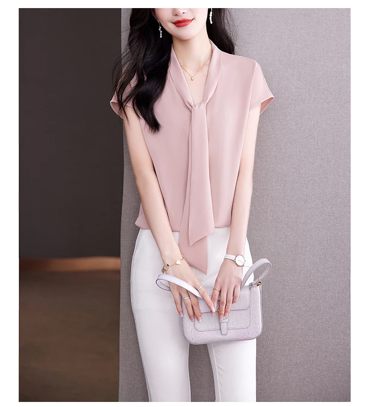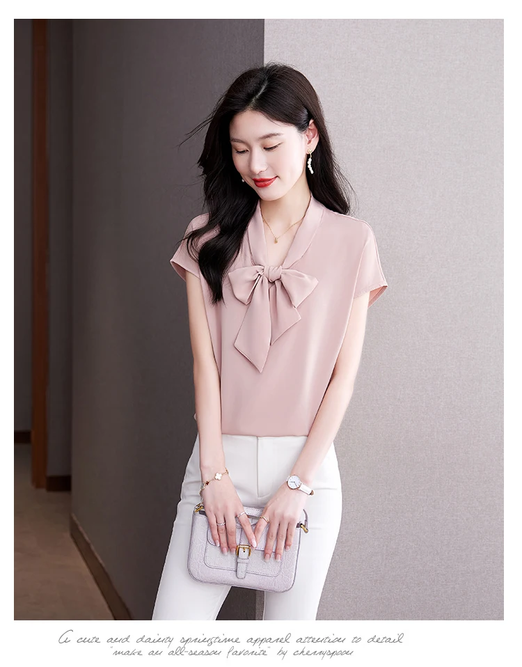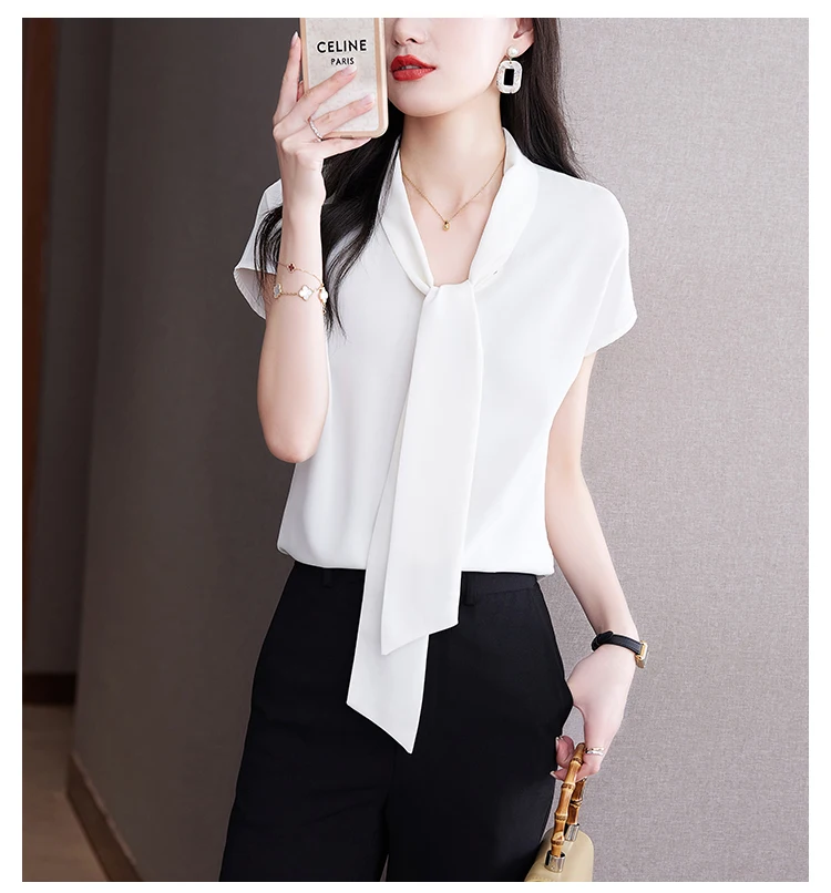 Bow Tie Blouse Shirt for Women OL Elegant Blouses Satin Womens Tops Silk Female Clothing 2023 Korean Fashion Short Sleeve Blouse