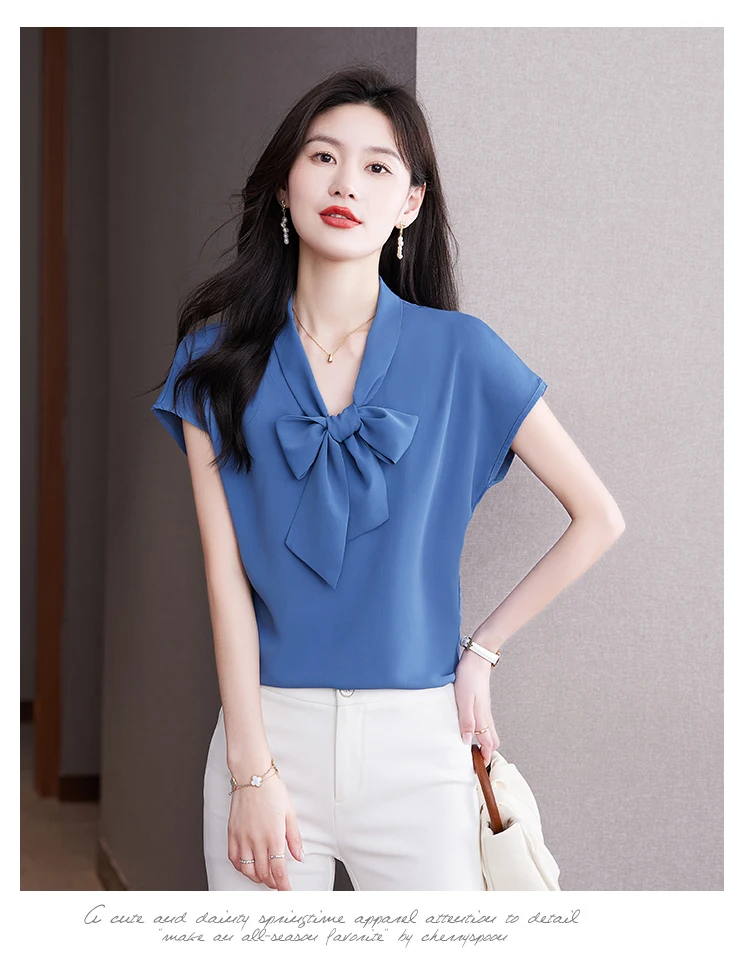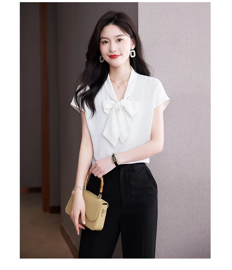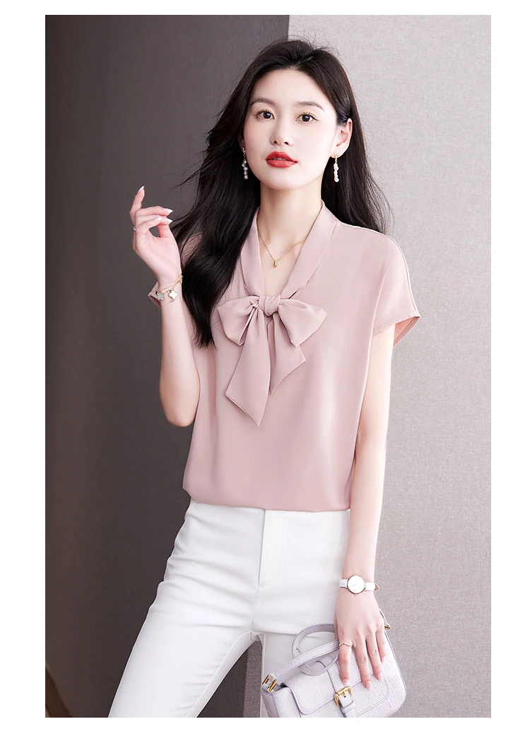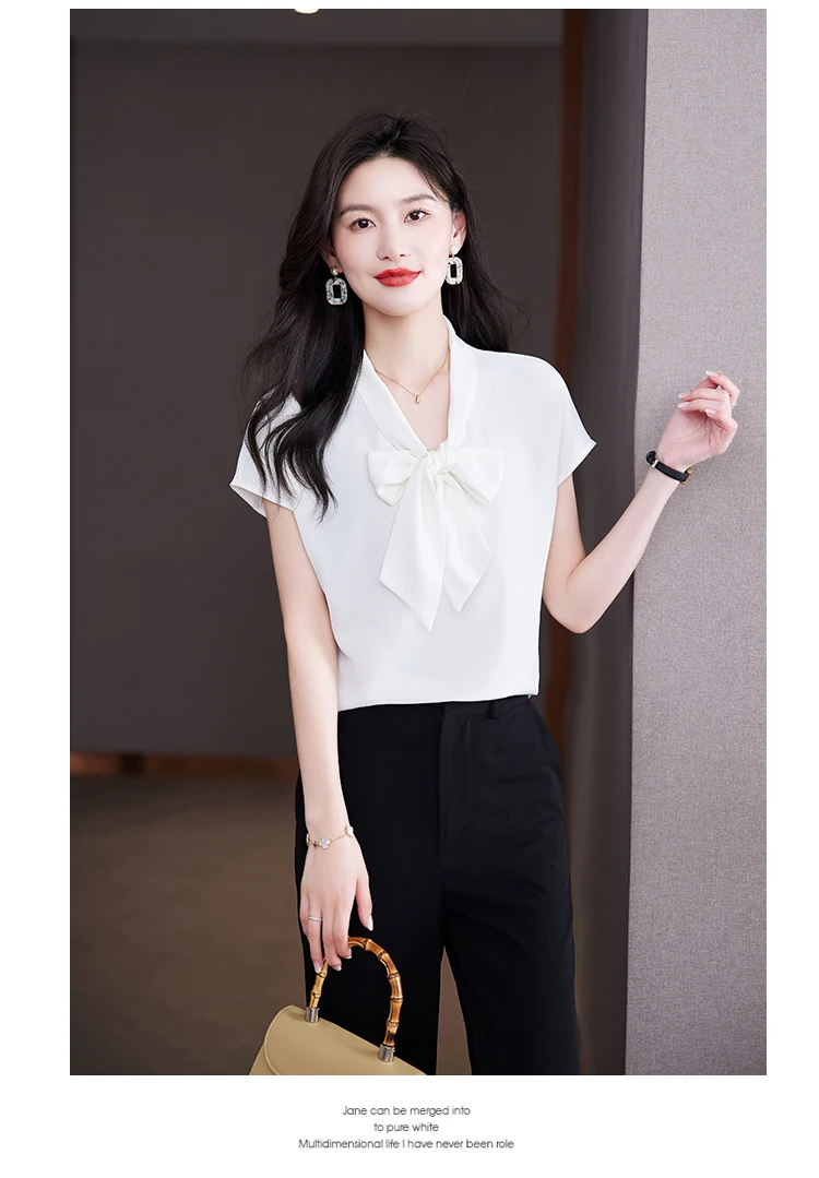 Bow Tie Blouse Shirt for Women OL Elegant Blouses Satin Womens Tops Silk Female Clothing 2023 Korean Fashion Short Sleeve Blouse