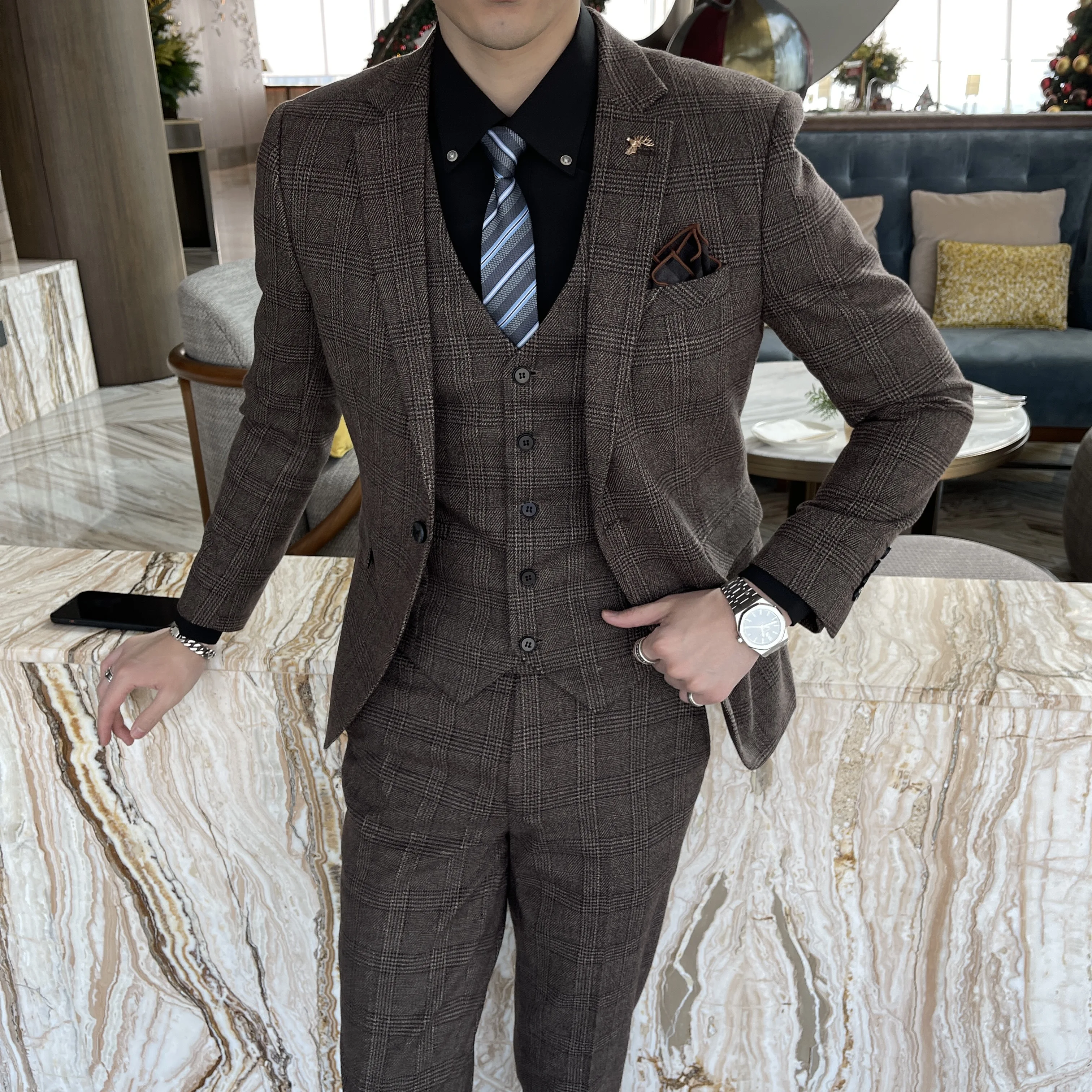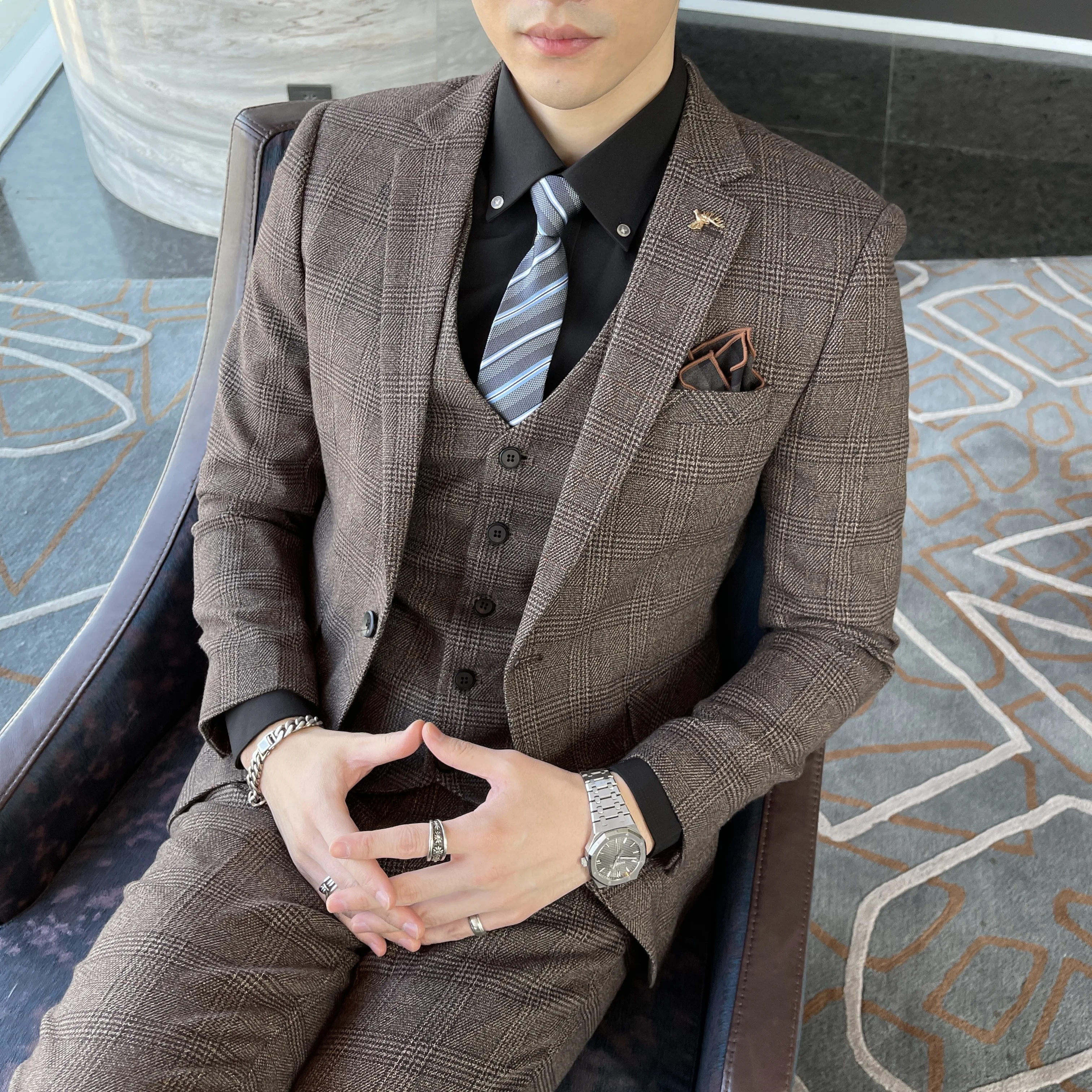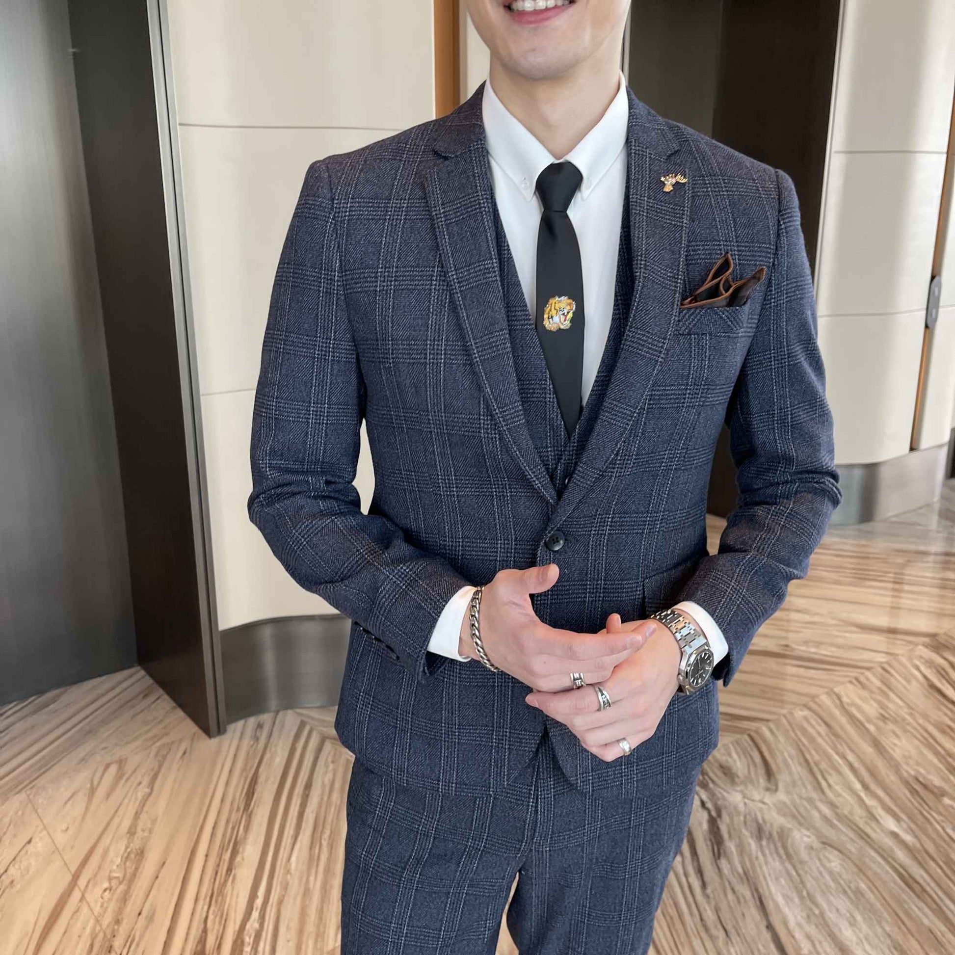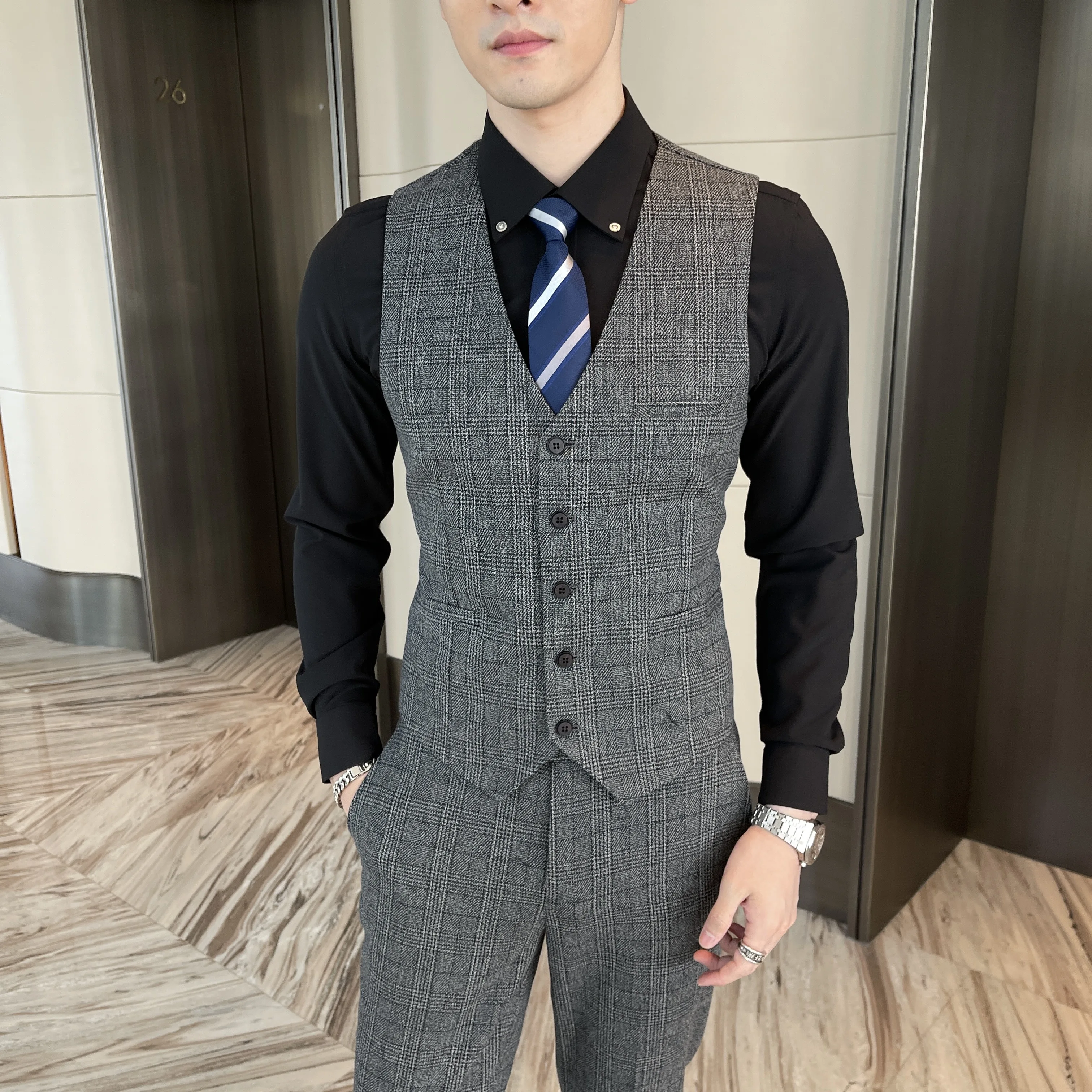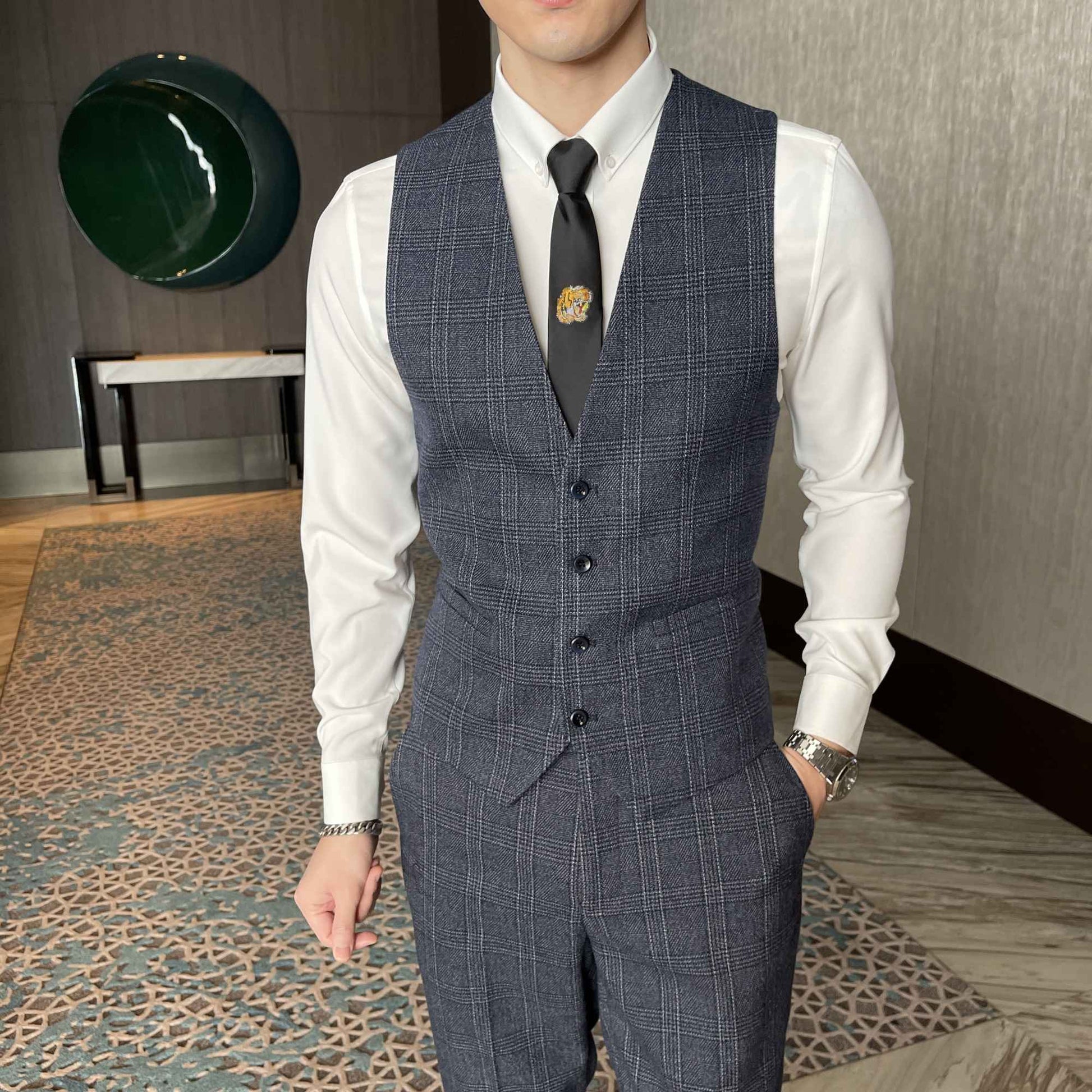 British Korean Style High Quality Modified Plaid Three-Piece Suit for Men - Stylish Business Casual Suit Vest And Trousers Set