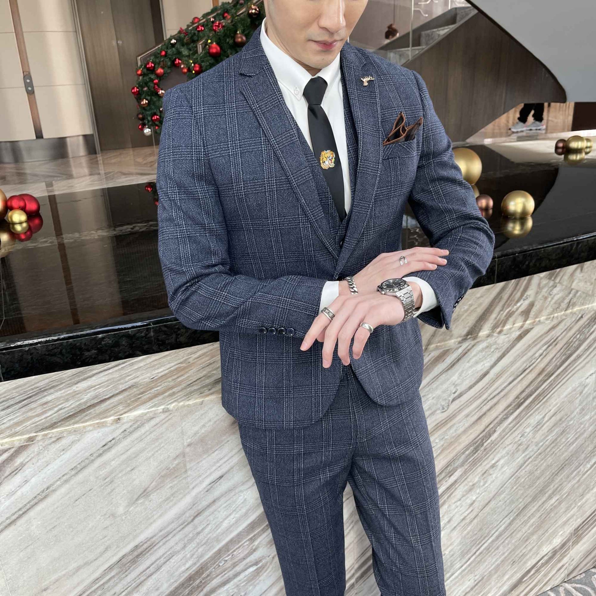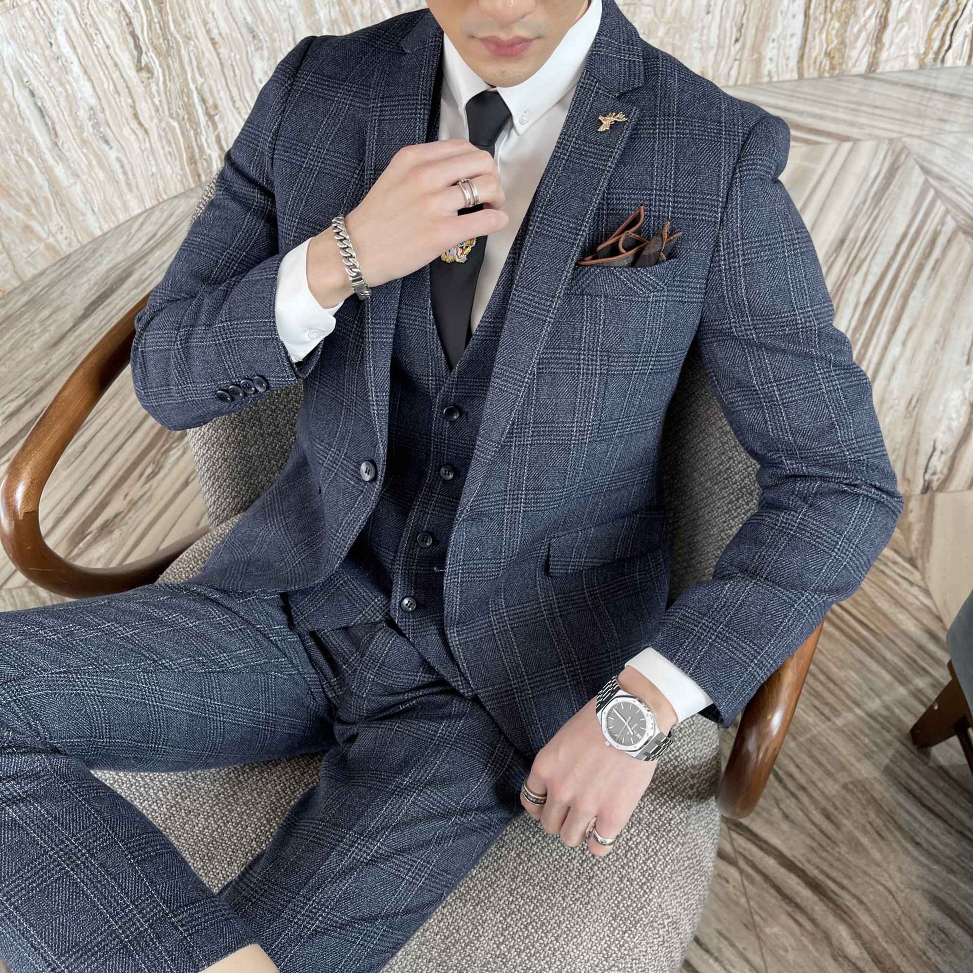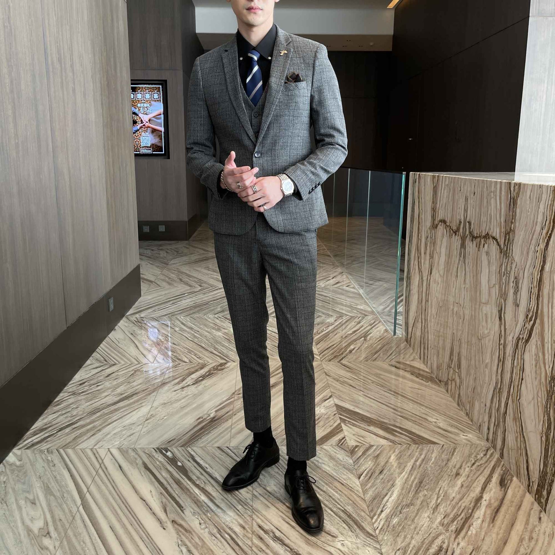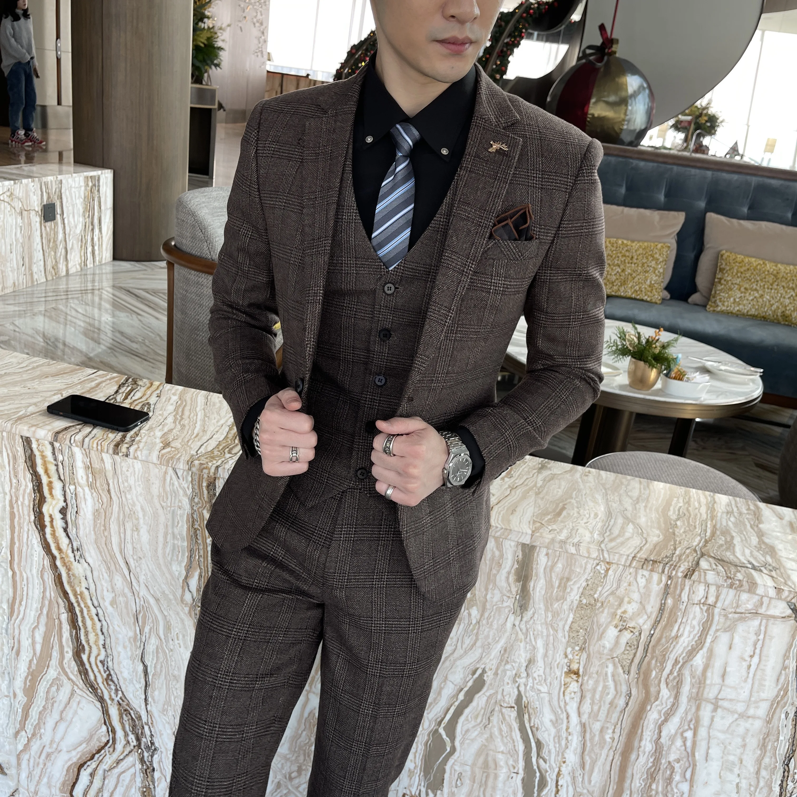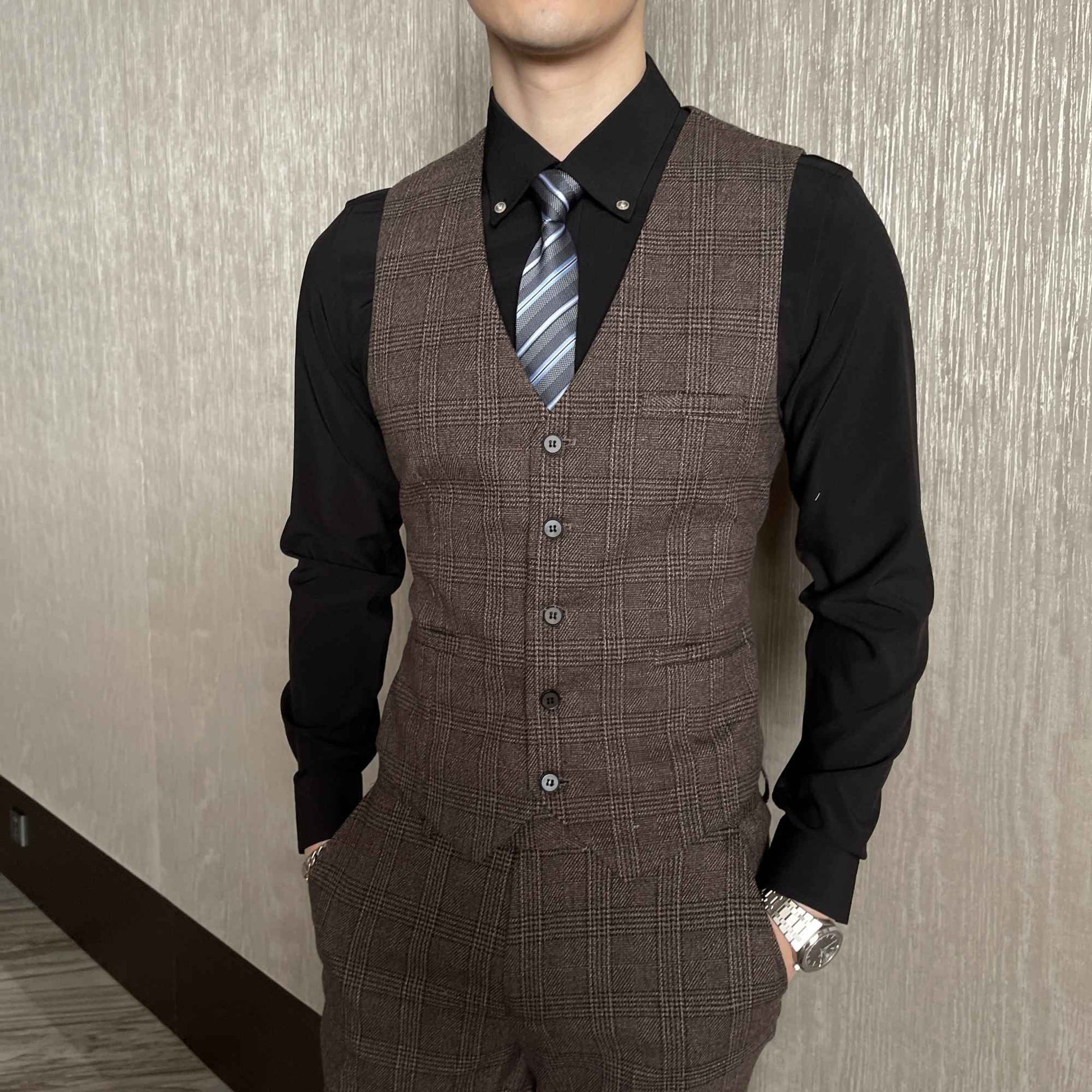 British Korean Style High Quality Modified Plaid Three-Piece Suit for Men - Stylish Business Casual Suit Vest And Trousers Set