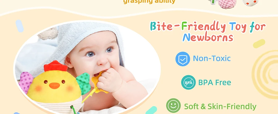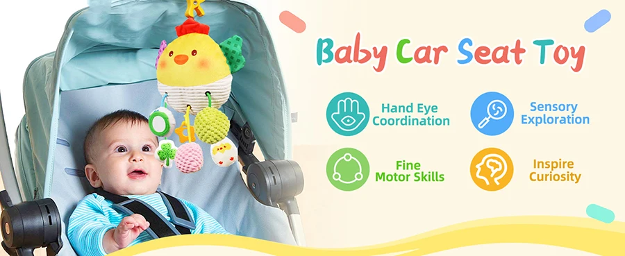 ?Baby-Safe Materials & Durable Design?This baby carseat toy is made from high-quality, non-toxic cotton with an ultra-soft texture, gentle on baby’s skin. It comes with a BPA-free, food-grade silicone pacifier to help relieve teething discomfort. Durable stitching and secure parts make it safe for grasping, chewing, and long-term use. Perfect for encouraging safe exploration while giving parents peace of mind during playtime