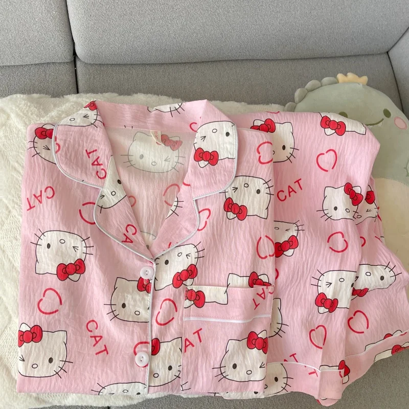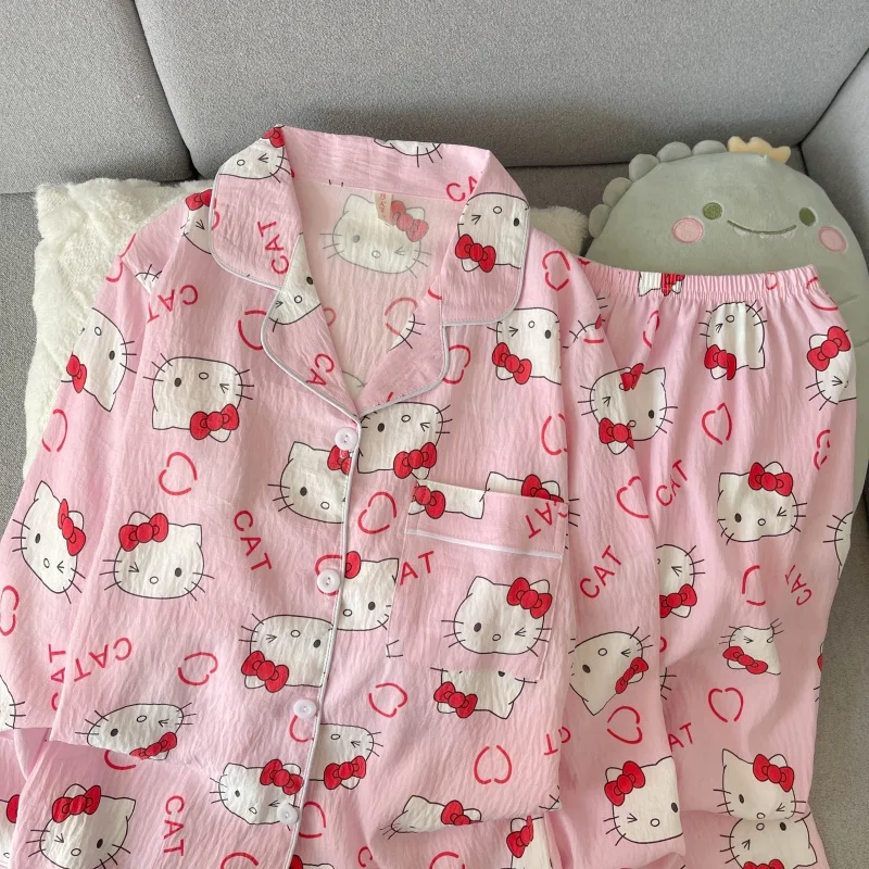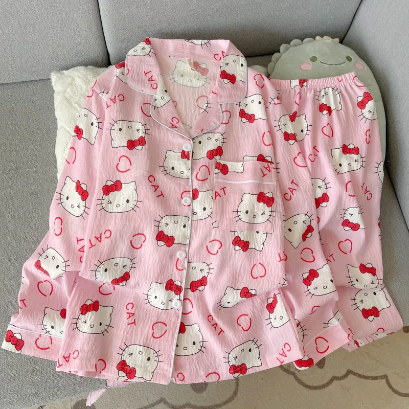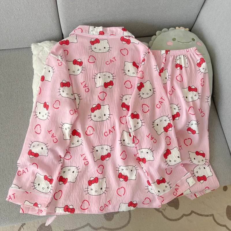 Cartoon Hello Kitty Pajamas Set Women's Autumn Winter Long Sleeve Loungewear Pink Cute Sleepwear Kawaii Soft Homewear Outfit