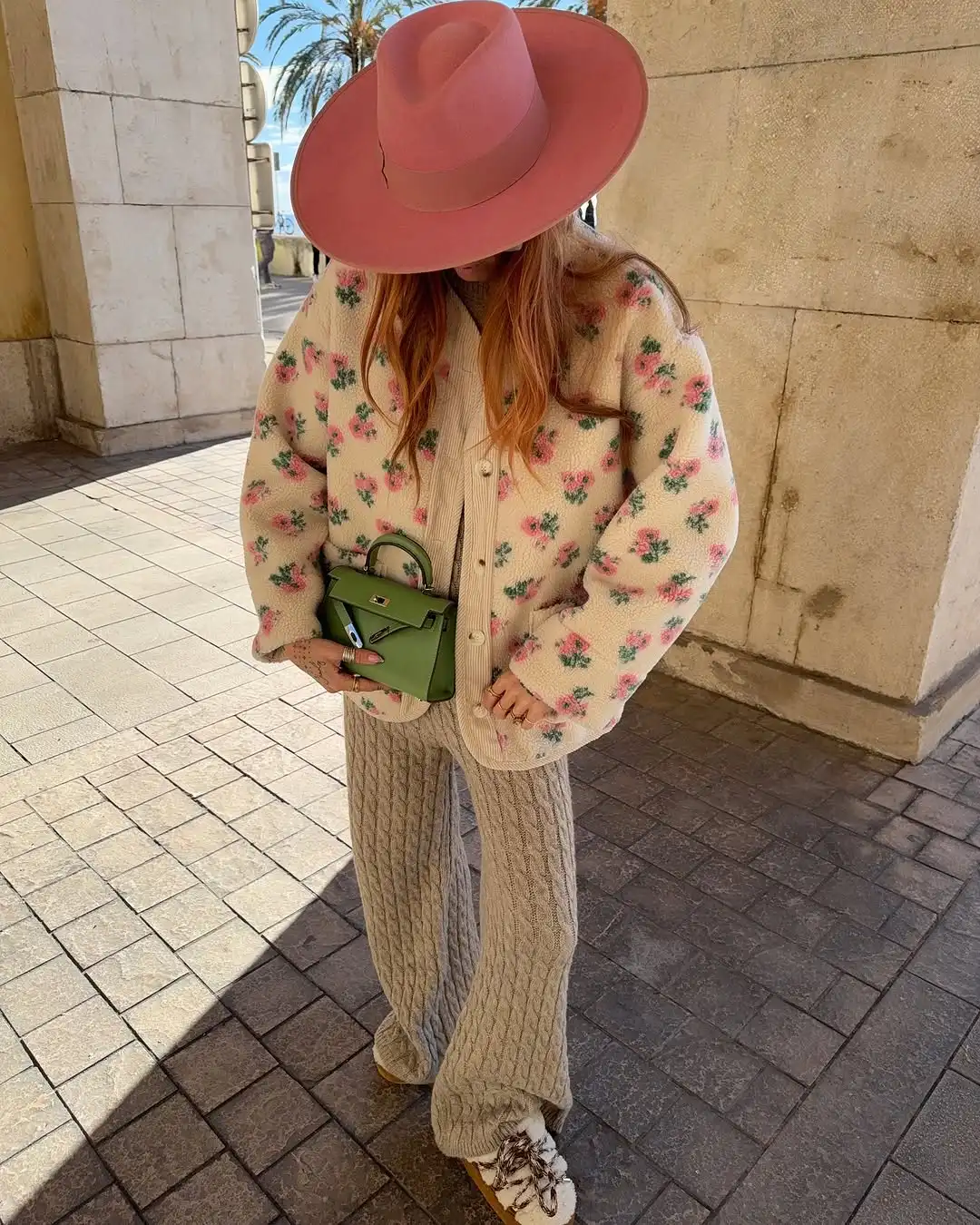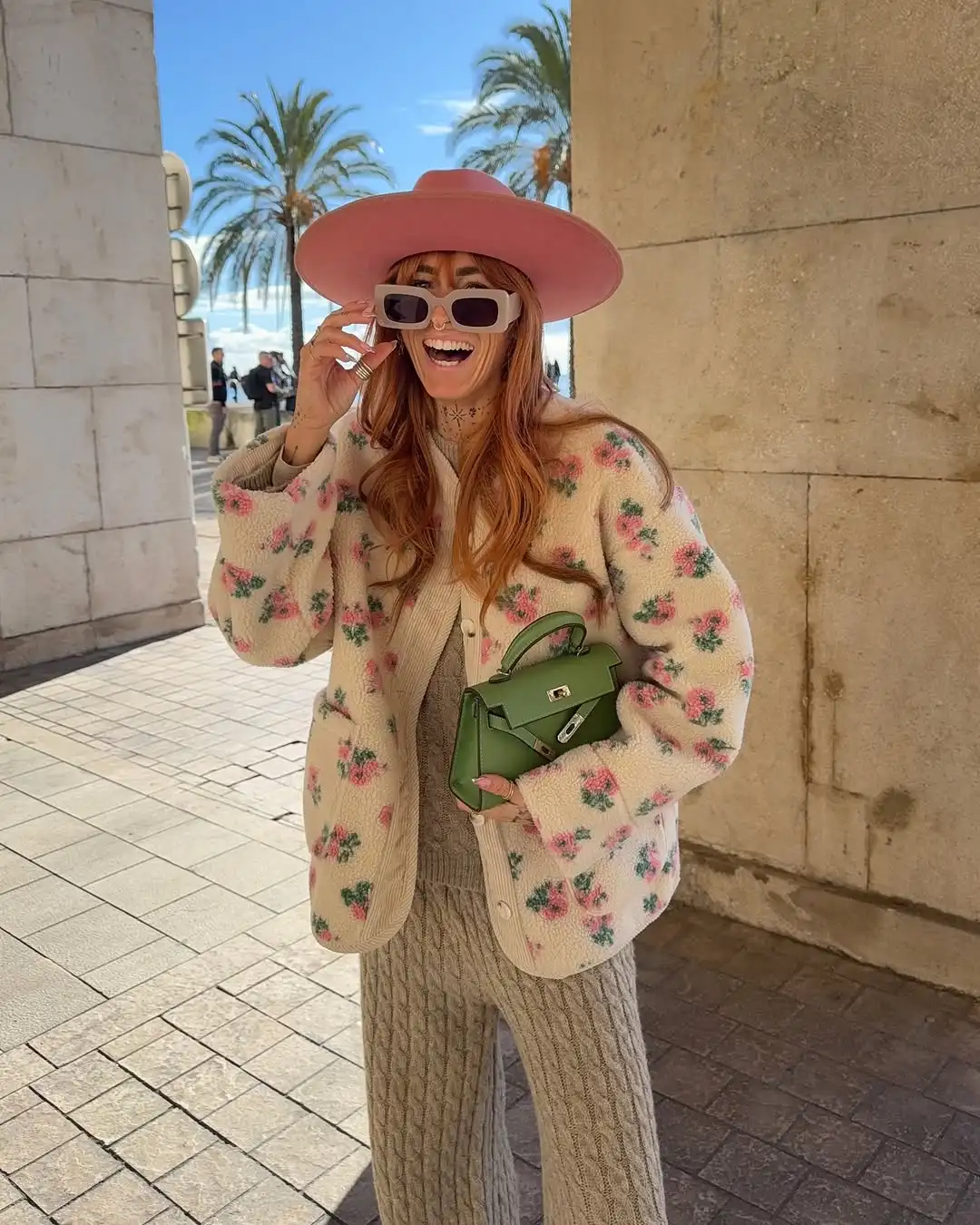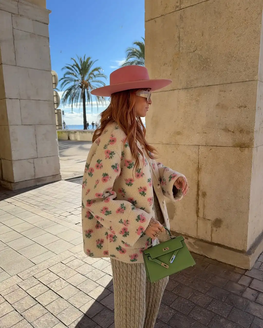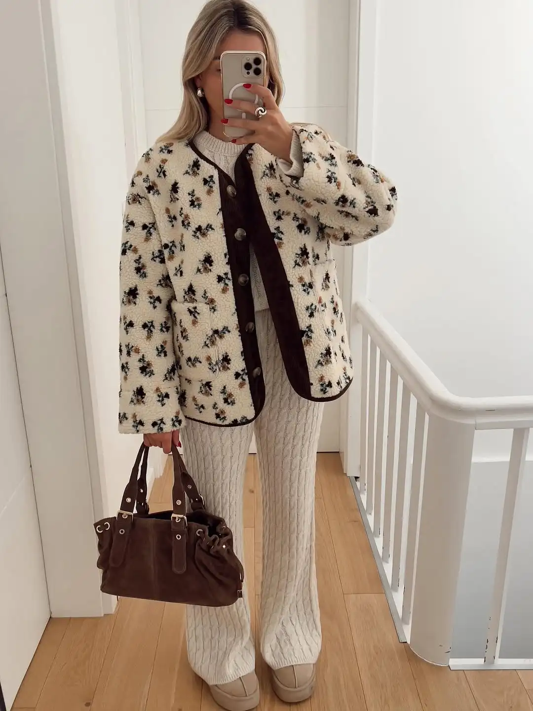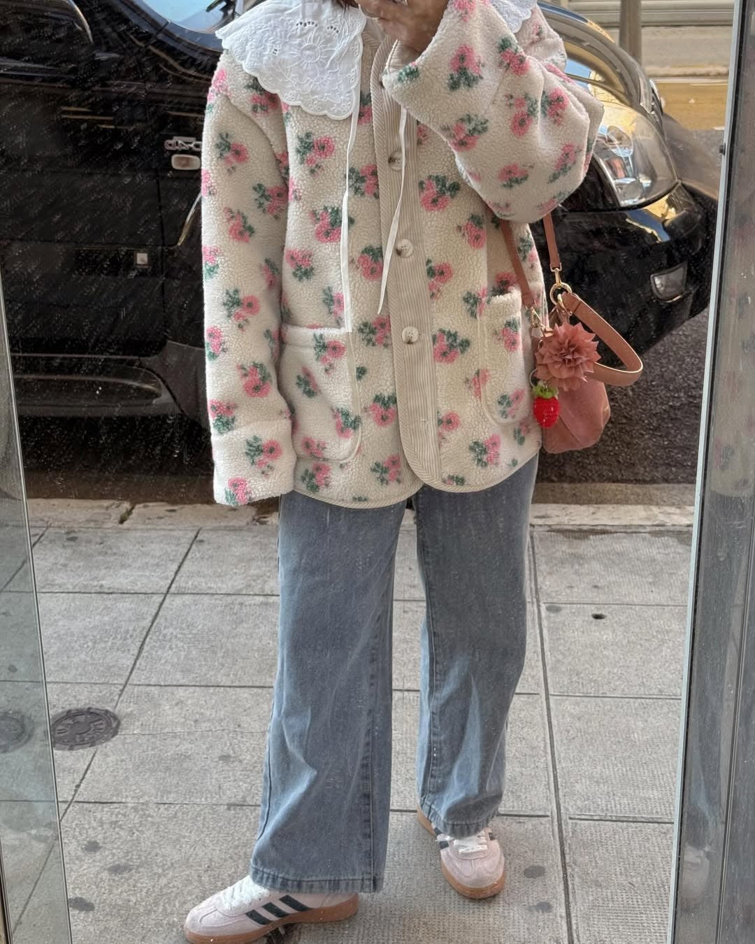 Casual Printed Short Fleece Jacket Women Fashion Round Neck Single Breasted Pocket Loose Jackets Lady Daily Commute Office Coat