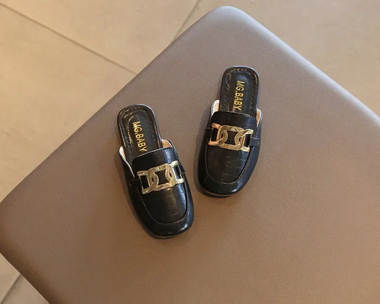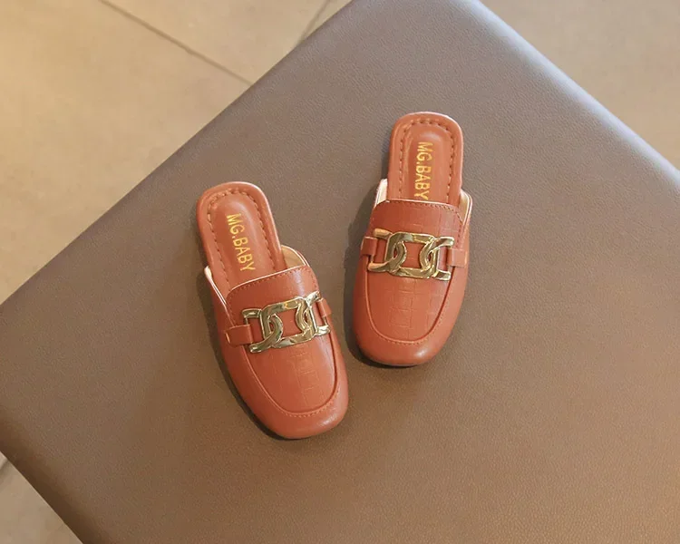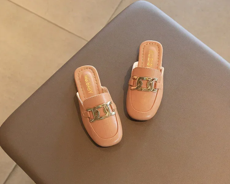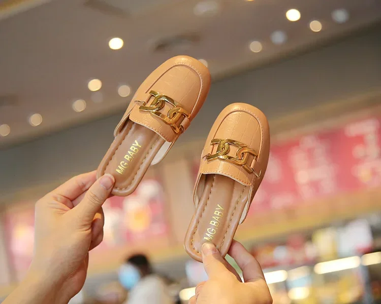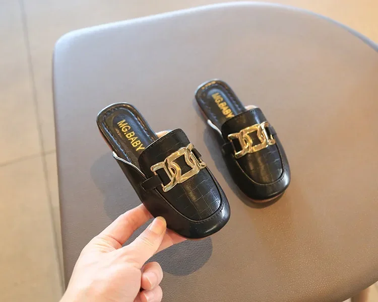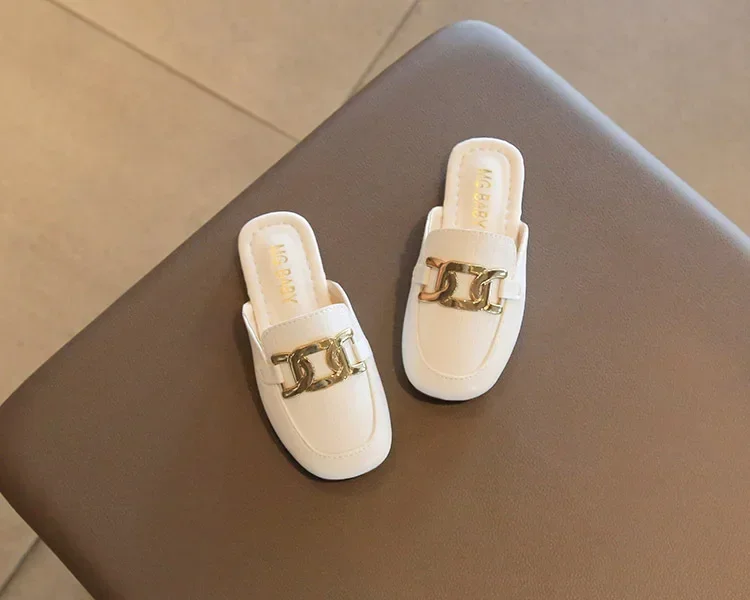 Children Sandals for Girls 2024 Summer New Girls Covered Toes Flat Leather Slippers Casual Lazy Metal Korean Kids Fashion Flats