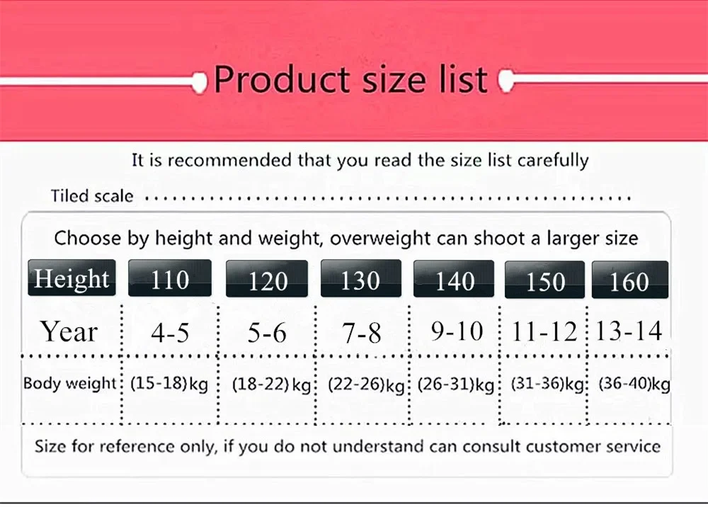 Size selection: Children of the same age have different heights and weights. There is no need to measure their chest circumference, the size should be selected based on the child's height and weight. Our detailed page has a size chart for reference