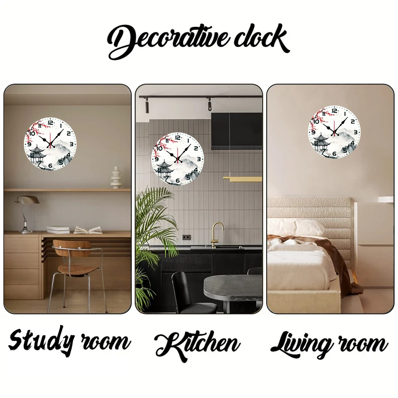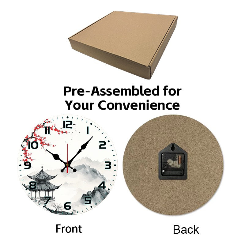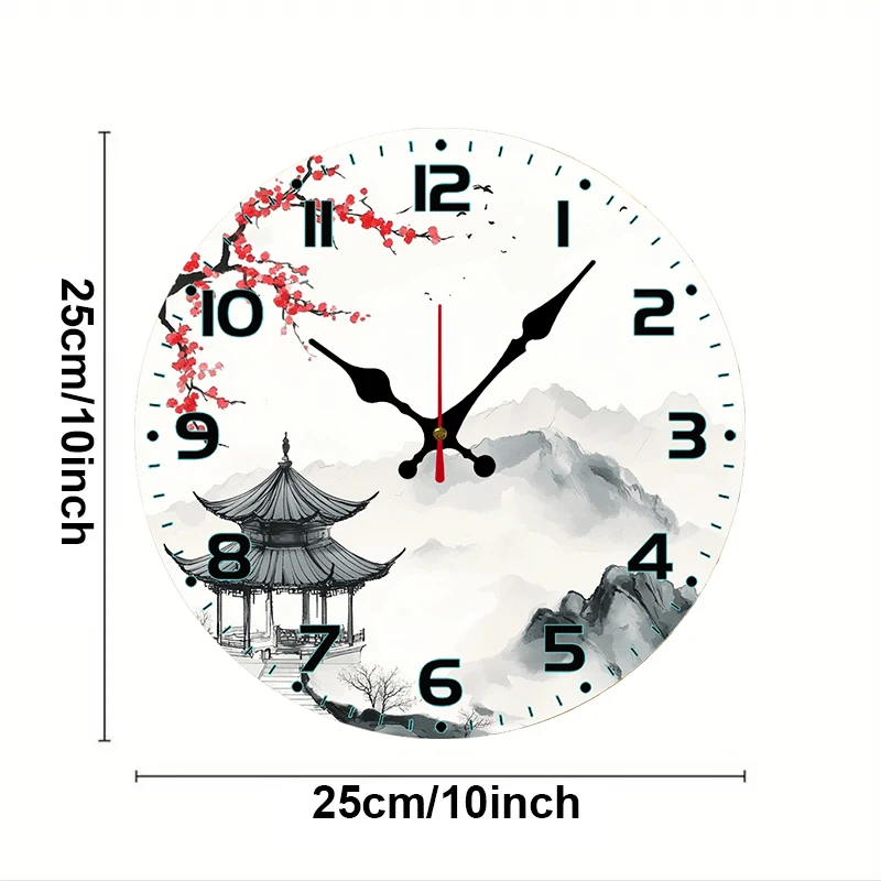 Chinese Landscape Wooden Round Silent Hanging Wall Clock, Suitable For Living Room, Office, Study Room, Bedroom, Home Decoration
