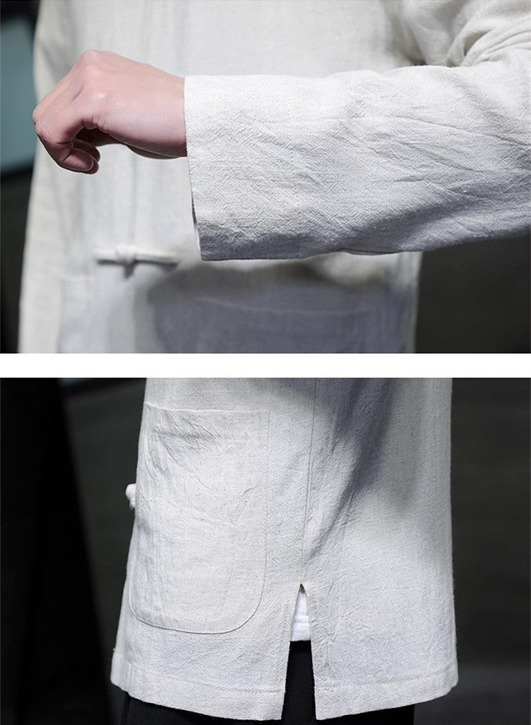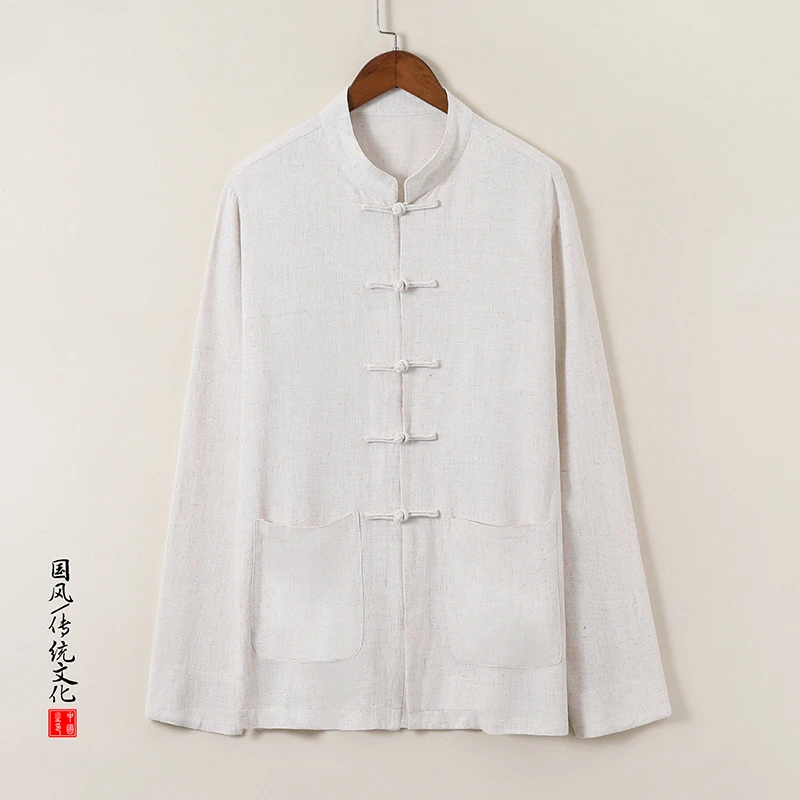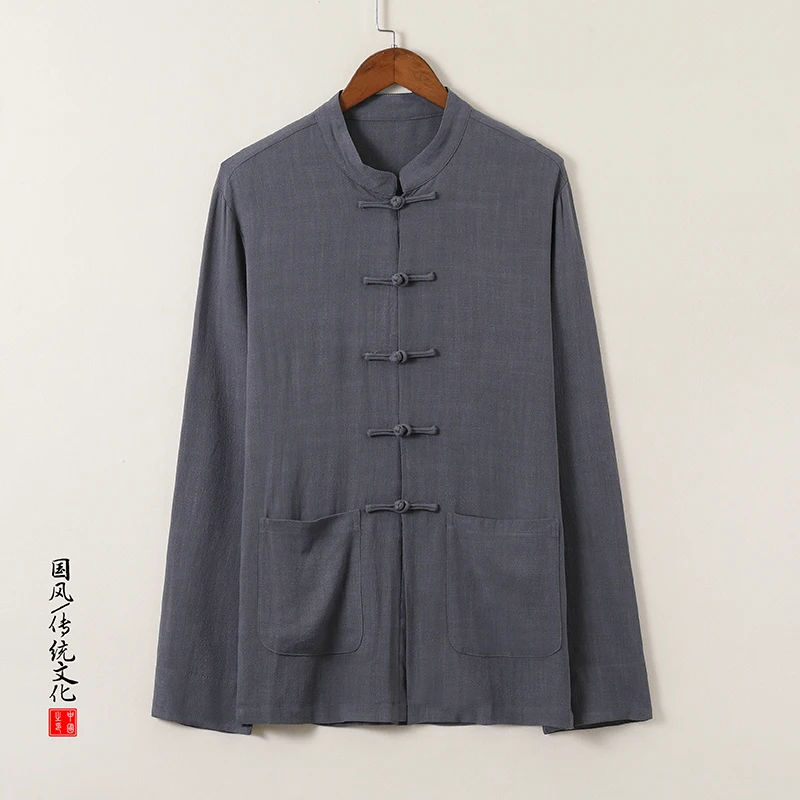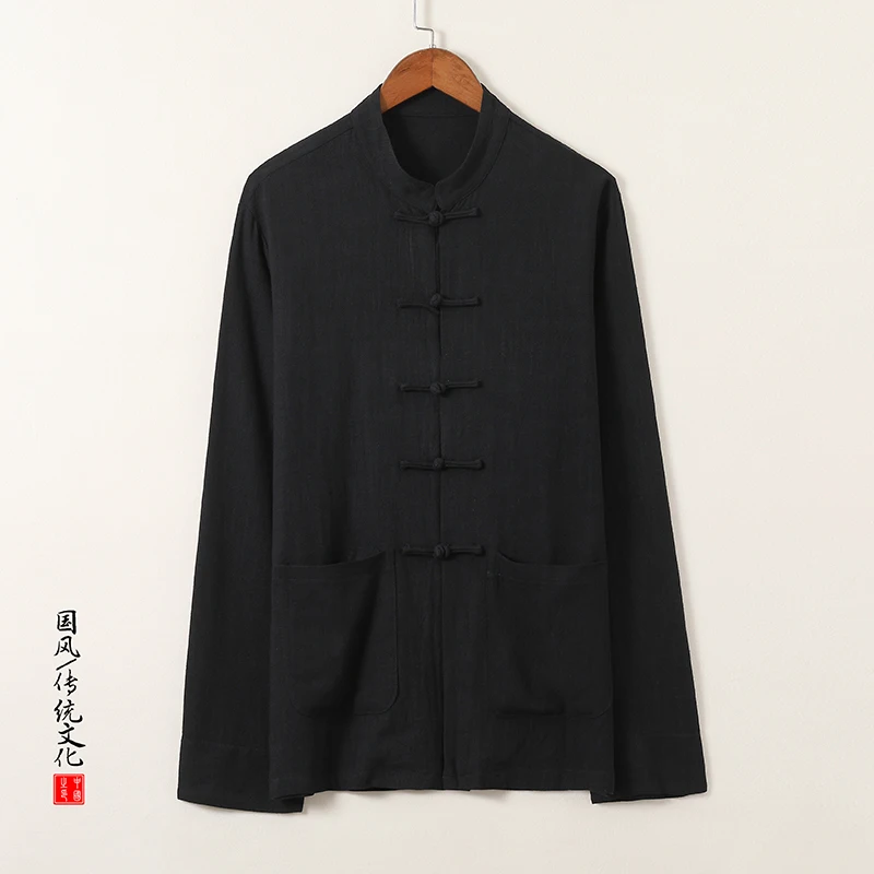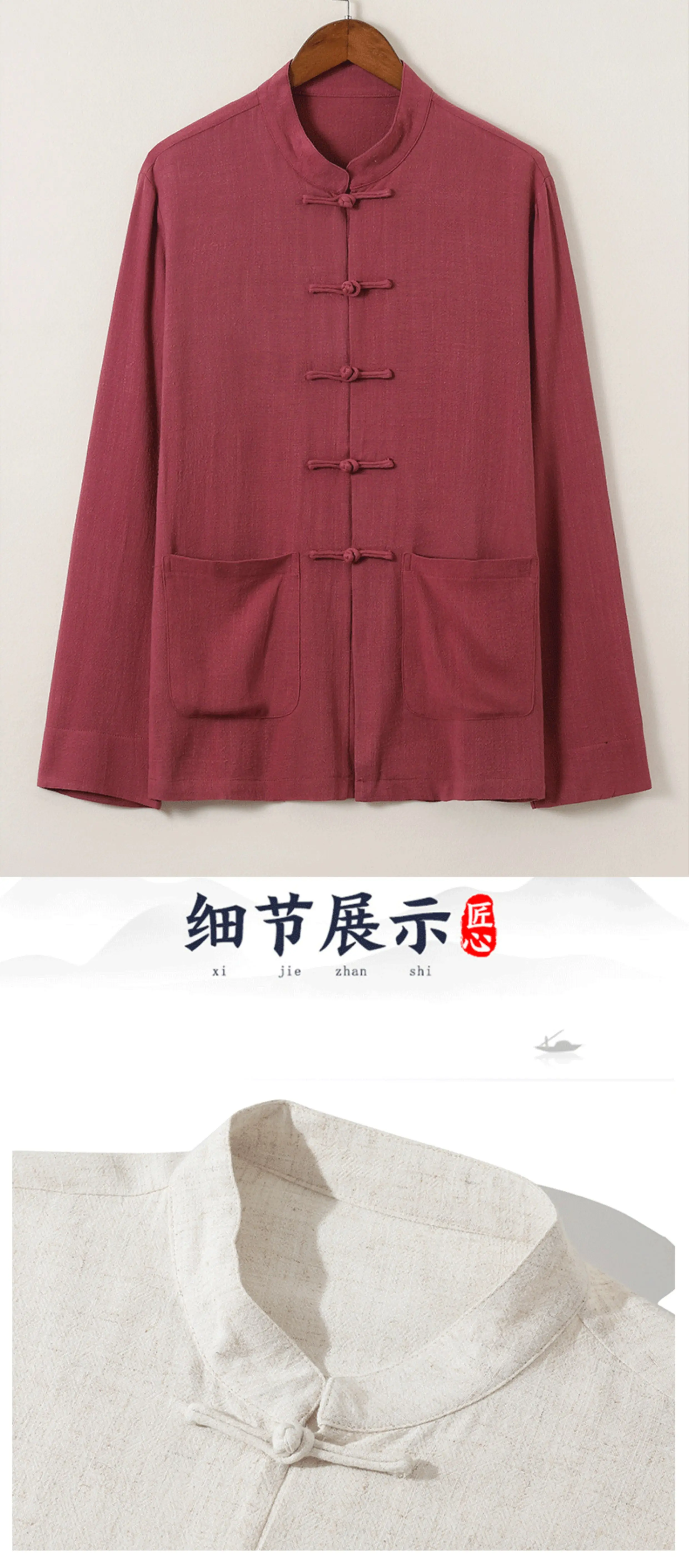 Chinese-style Men's Black Long-sleeve Shirt, Cotton-linen Blend Stand-up Collar Shirts, Available in Burgundy, Beige, and Gray.