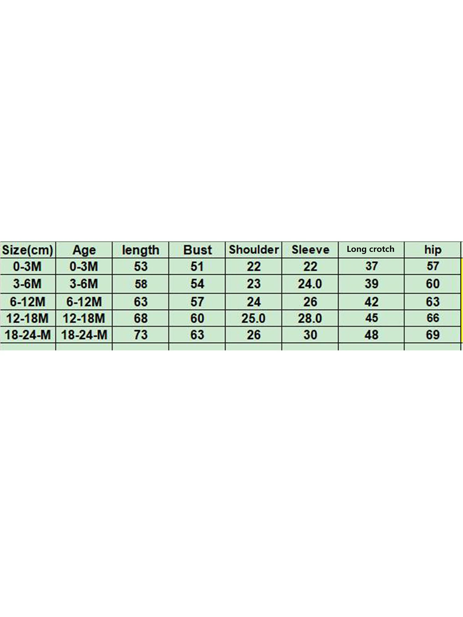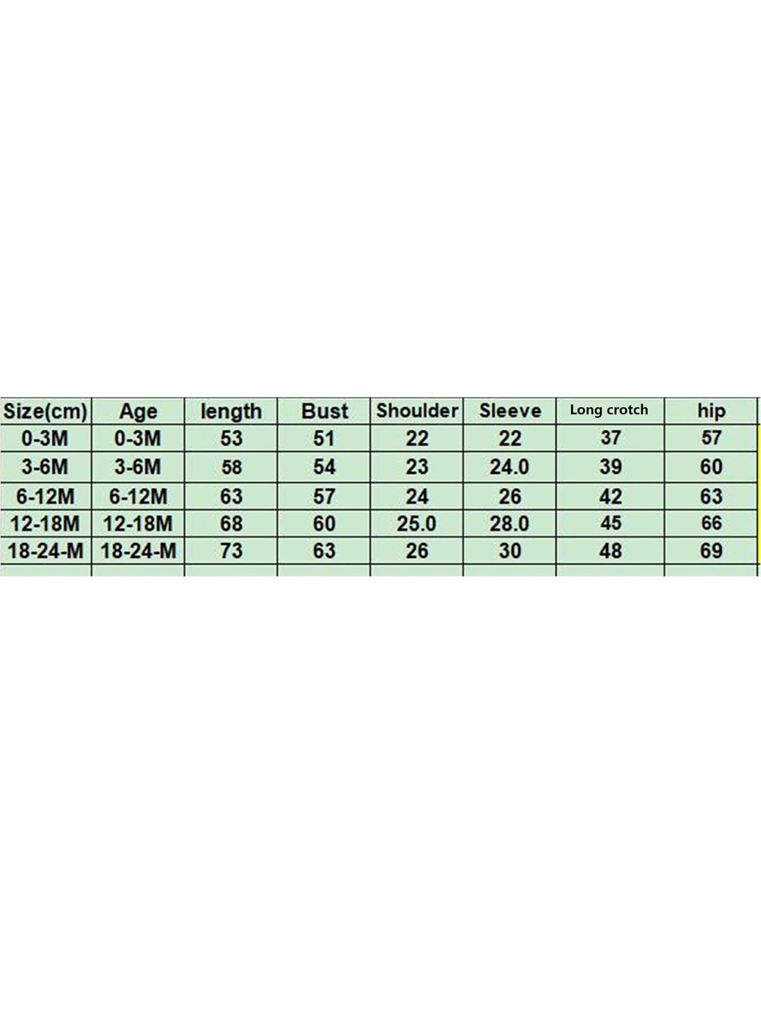 3-6M Length: 58 Bust: 54 Sleeve: 24 Shoulder: 23 Hip: 60 Suggest Age: 3-6 Months