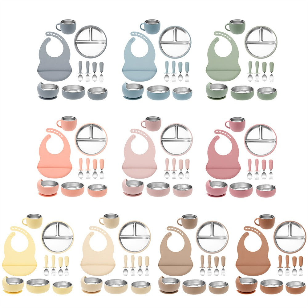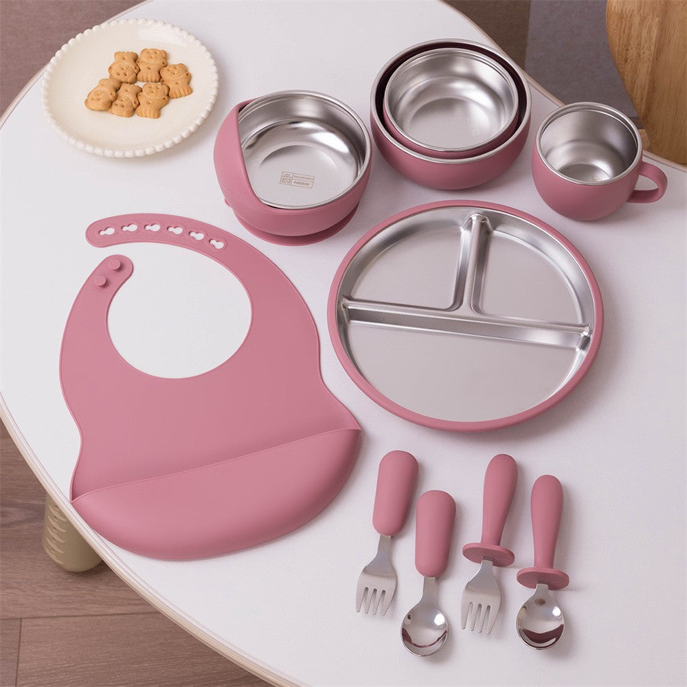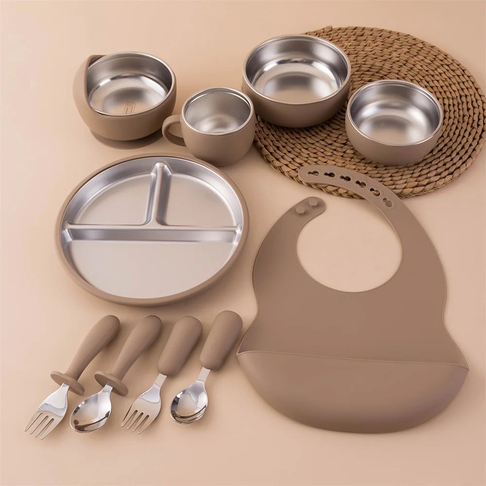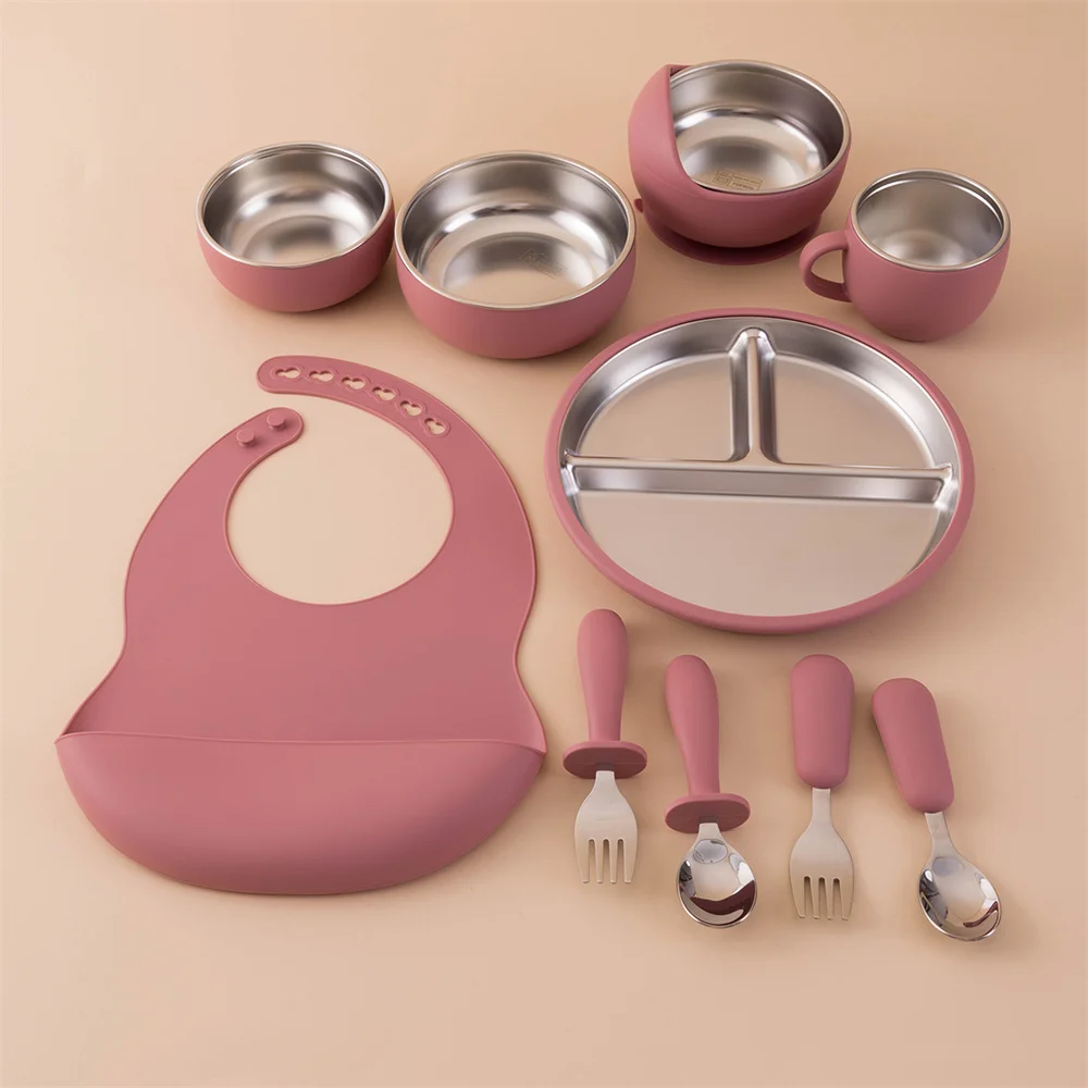 Color Kids 10PCS Infant Feeding Set Stainless Steel Silicone Tableware With Detachable Bowl Plate Bib Weaning Utensils For Baby