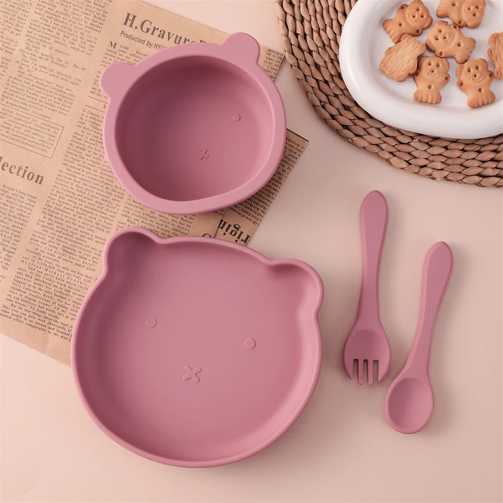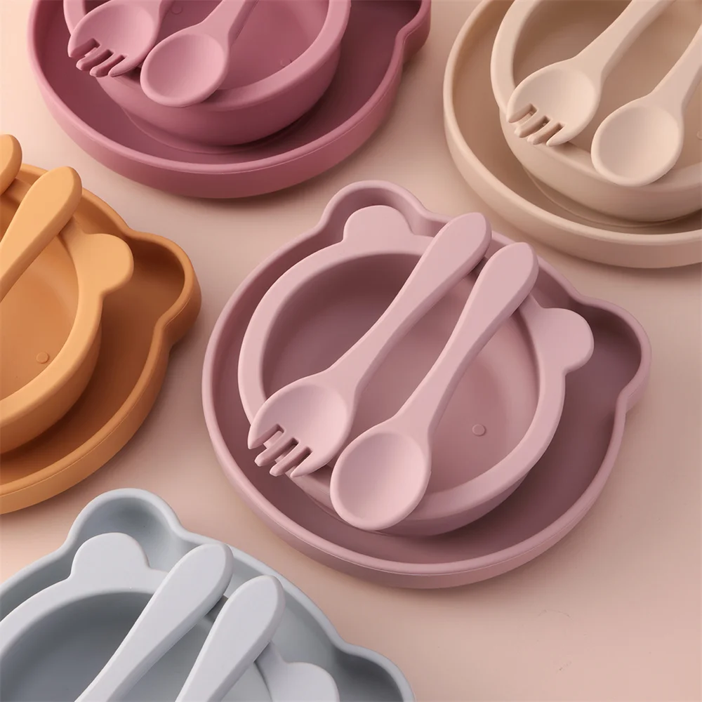 Color Kids 4PCS Silicone Feeding Tableware Set Baby Newborn Items Sucker Dishes Spoon Fork Bowls Food Training Essentials
